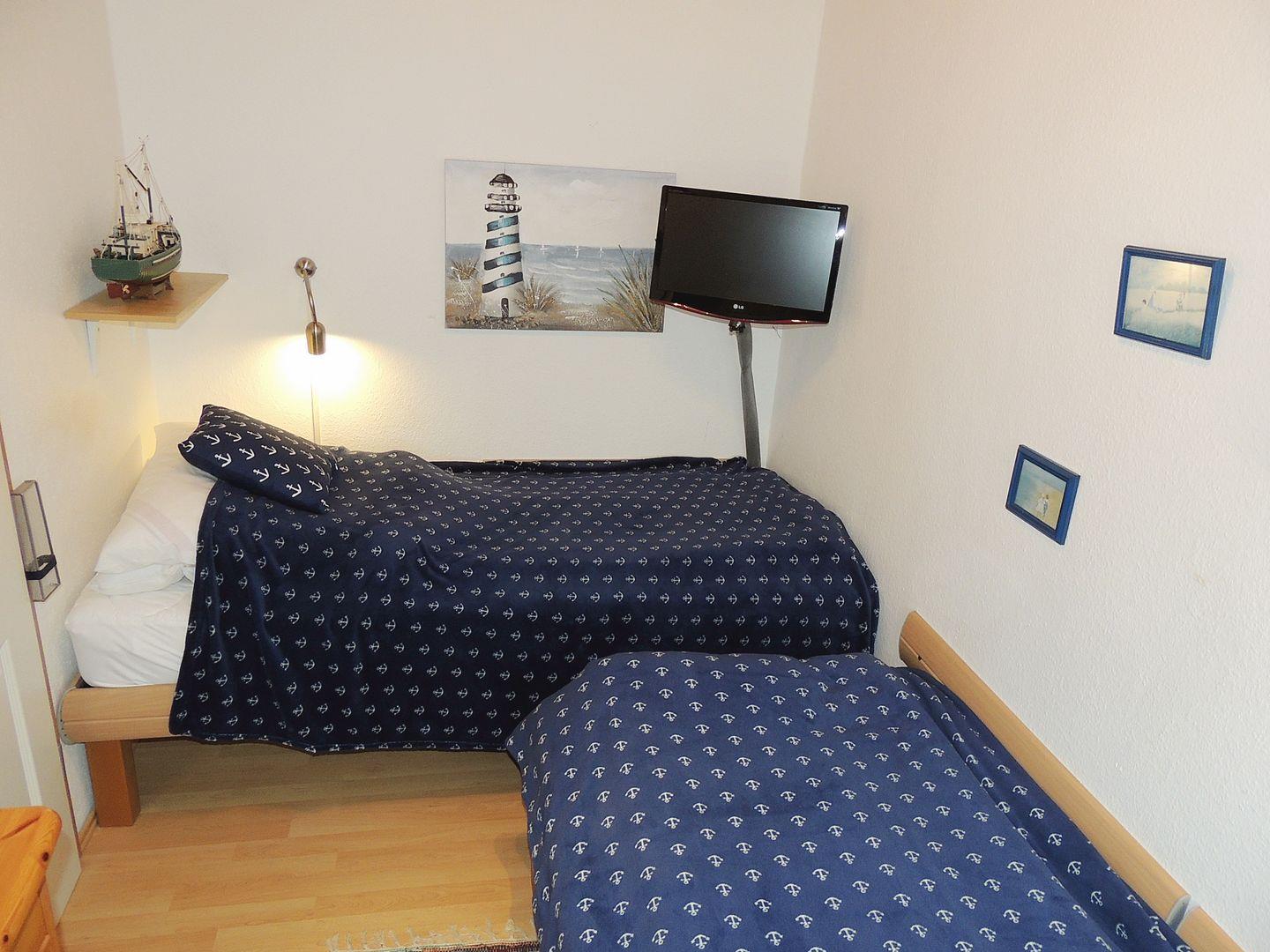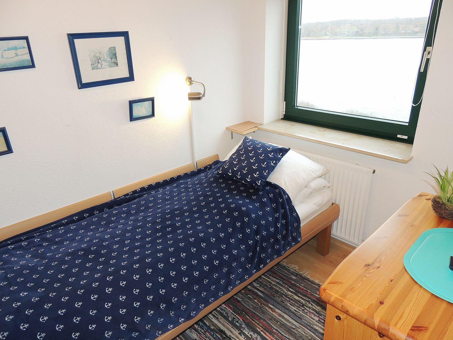 Das separate Kinderzimmer ist ebenfalls mit 2 gemütlichen Einzelbetten und zusätzlich mit kleinem Flat-TV ausgestattet. Auch hier bietet das Fenster einen Ausblick auf den Binnensee.