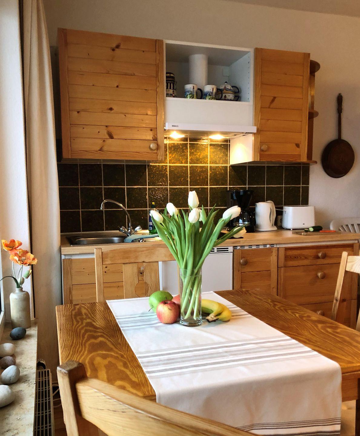 Vom Esstisch an der Fensterfront genießen Sie die herrliche Aussicht aus dem 2. Stock über den Binnensee. Mit dieser Aussicht schmeckt das Urlaubsmenü aus der angrenzenden Küchenzeile gleich doppelt so gut. Diese ist mit Kühlschrank mit Gefrierfach, 2-Feld-Ceranherd, Spüle, gängigen Geräten und Geschirr ausgestattet.
