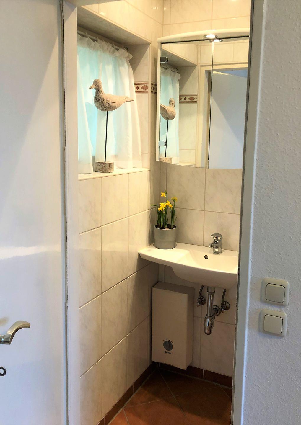 Gegenüber gelangen Sie in das kleine Duschbad mit beleuchtetem Spiegelschrank, 2 Steckdosen, Tageslichtfenster, WC und Duschkabine.
