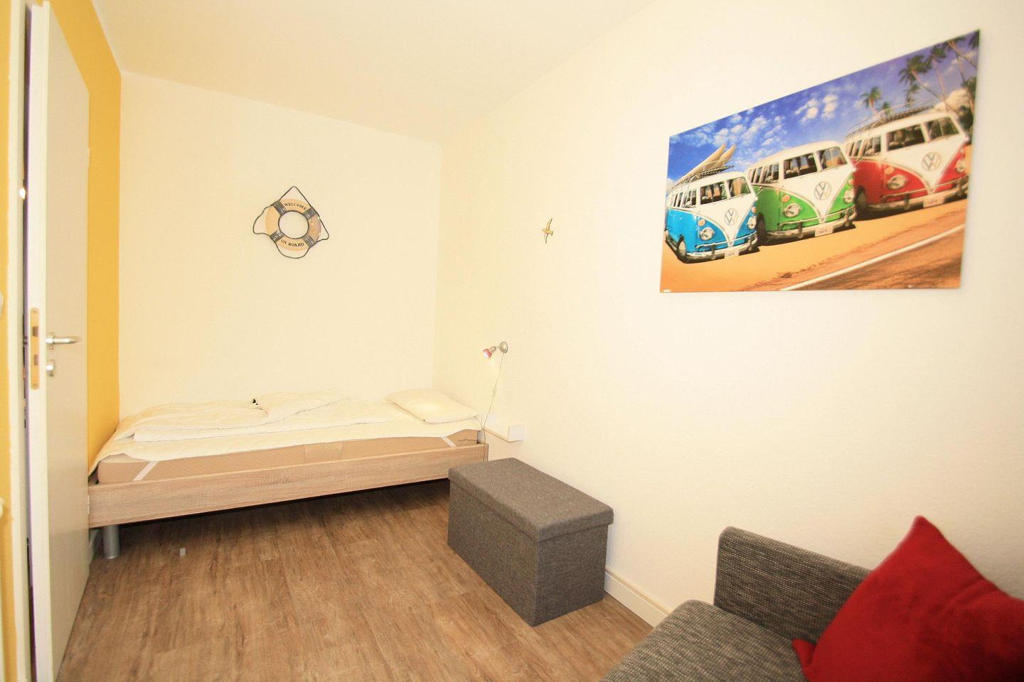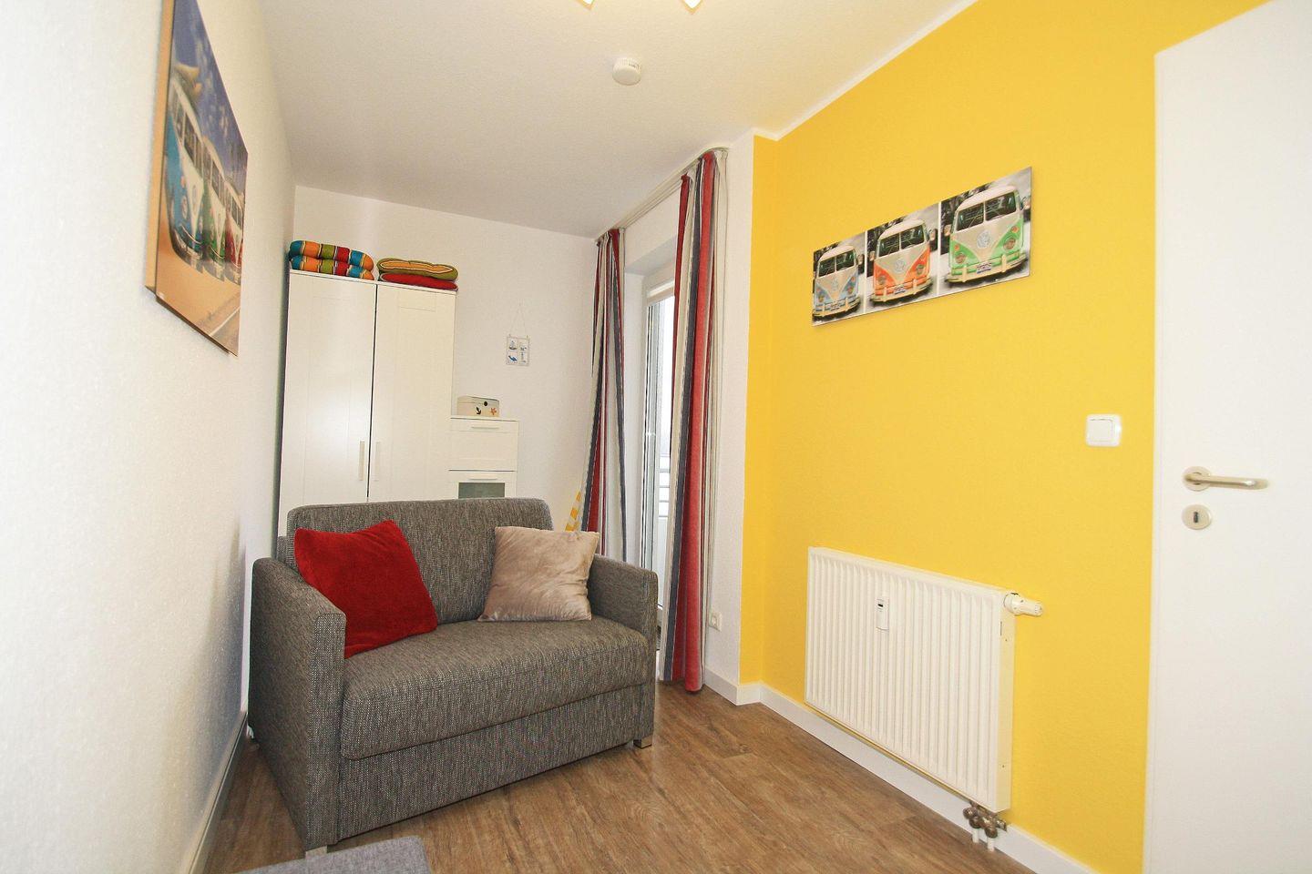 Im hinteren Teil des Wohnbereiches befindet sich das Ehebett. Die Couchgarnitur besteht aus einer modernen grau und schwarzen sehr gemütlichen 3-Sitzer-Struktureckcouch. Vom großzügigen Essplatz (mit 4 zeitgemäßen und bequemen Stühlen und Holztisch) aus, der sich am Fenster befindet schweift der Blick träumerisch zum Binnensee. Das Kinderzimmer ist mit einem Einzelbett, großem Kleiderschrank und zusätzlicher (Schlaf)-Couch (mit Matratze- sehr bequem) ausgestattet. Die moderne und helle Küchenzeile in L-Form -technisch mit 4-Platten-Ceranfeld, Backofen und Geschirrspüler ausgestattet- lädt den Hobbykoch zum schnellen Snack oder einem größeren Menü ein. Das helle Duschbad mit Kabine und Hänge-WC ist komplett gefliest. Ein großer 40 Zoll LCD-TV samt DVD und Stereo-CD-Radio sorgt für Kurzweile.