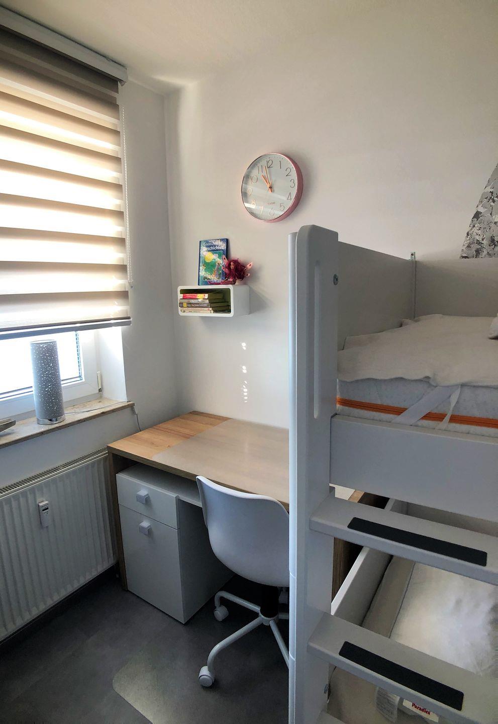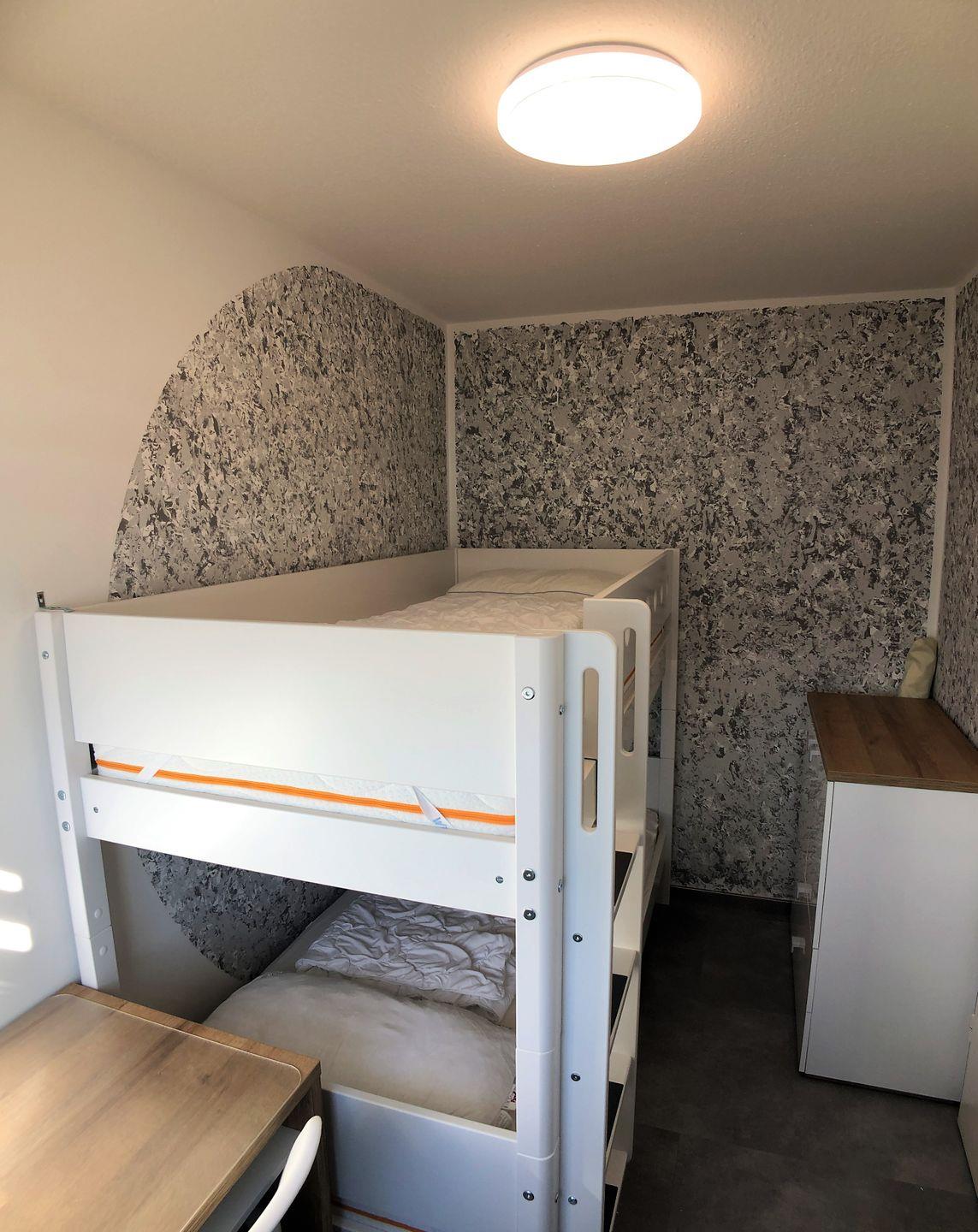 Im Kinderzimmer schlafen die Kleinen exklusiv auf dem neuem, hochwertigen Etagenbett. Für ein ungestörtes Mittagsschläfchen lässt sich das Seeblick-Fenster durch Rollo und Jalousien abdunkeln. Schreibtisch, Kommode, Bücher und Spiele stehen hier ebenfalls zur Verfügung.