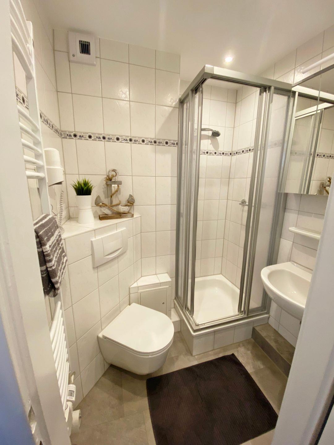 Das helle Badezimmer ist mit Duschkabine, Handtuchheizkörper, beleuchtetem Spiegelschrank, einem Haartrockner und WC ausgestattet.