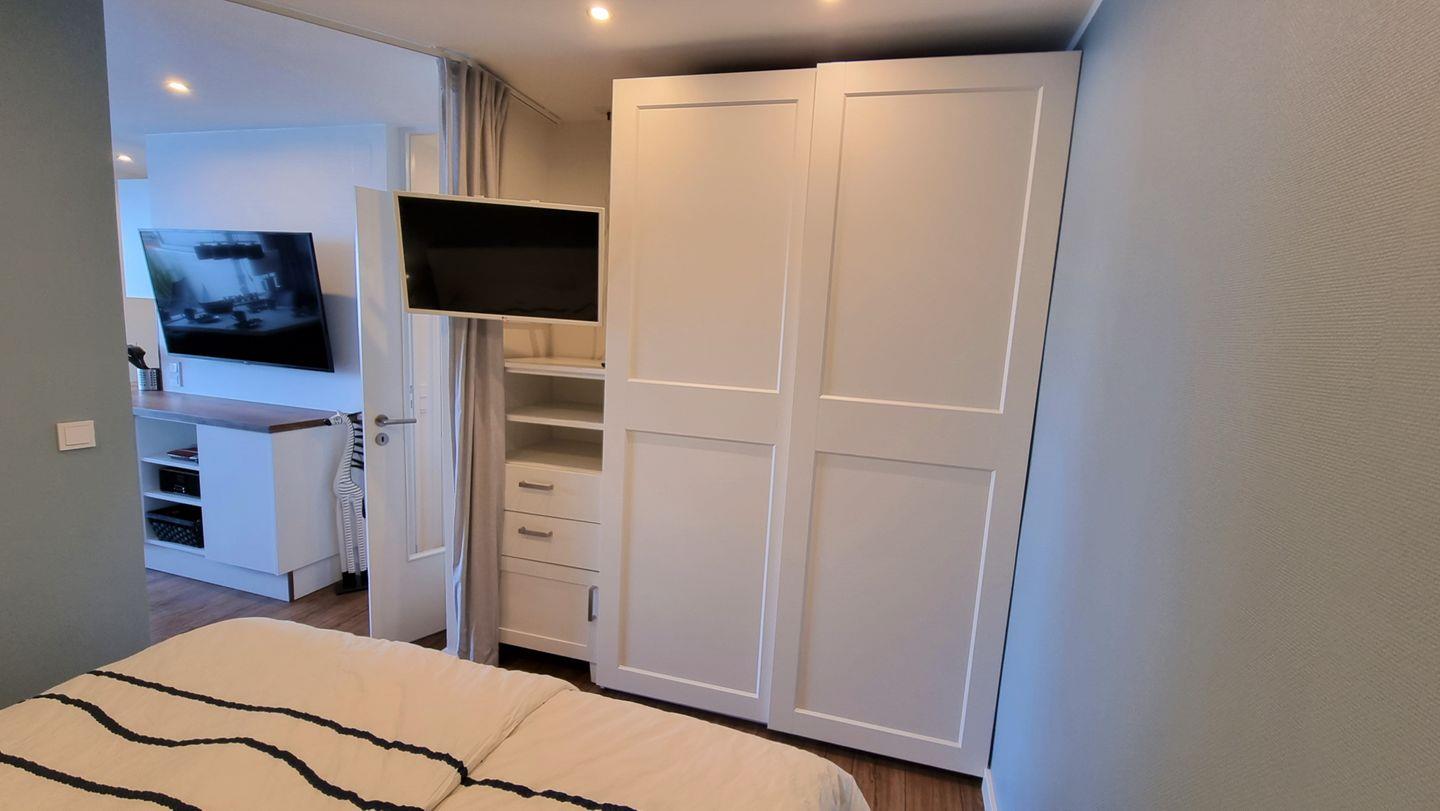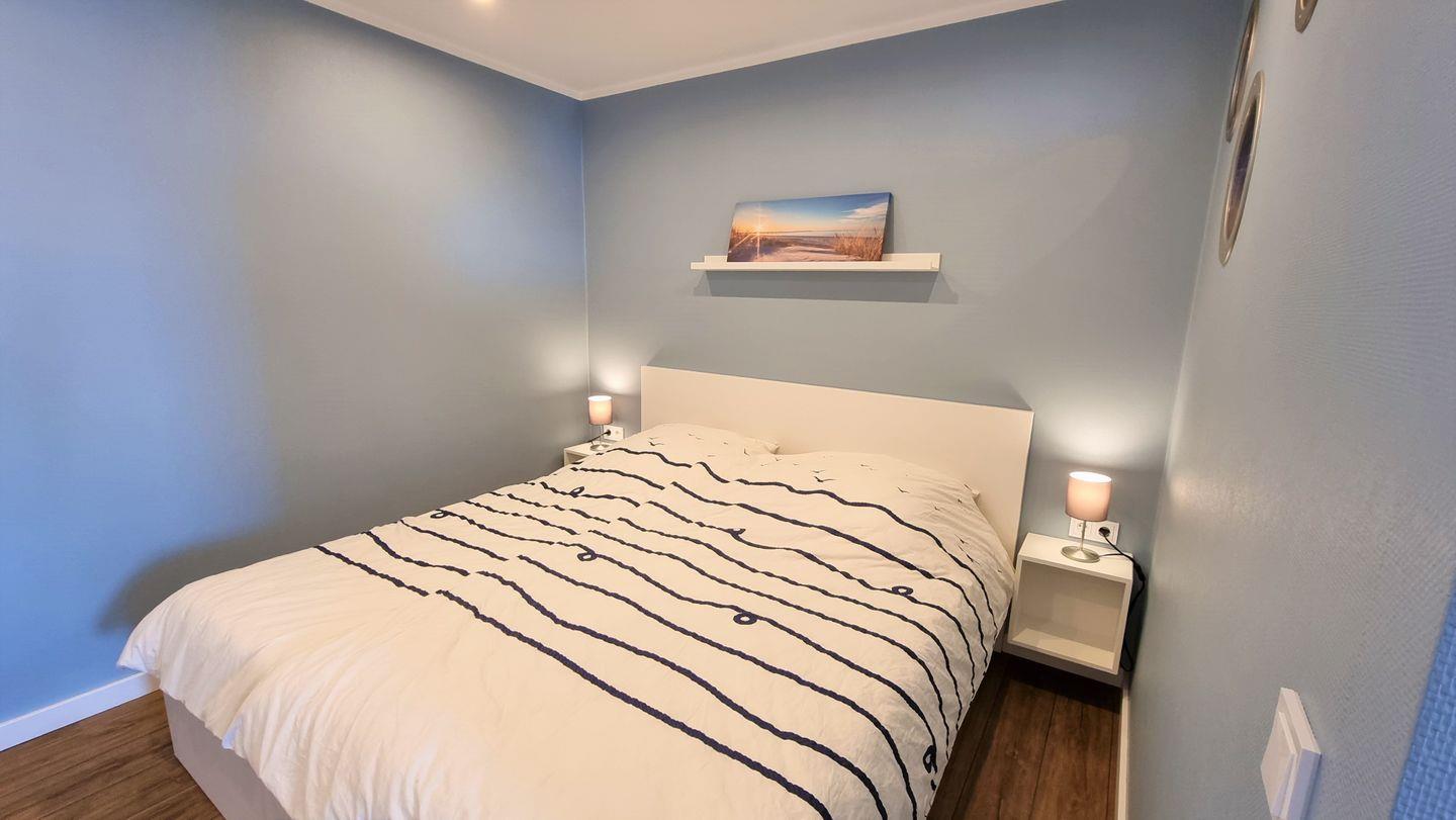 Der separate Elternschlafbereich mit Doppelbett (2x 90*200 cm) und Fernseher (80 cm Durchmesser) ist durch eine maritime Wand mit Bullaugen abgetrennt und kann durch einen Vorhang zusätzlich separiert werden.