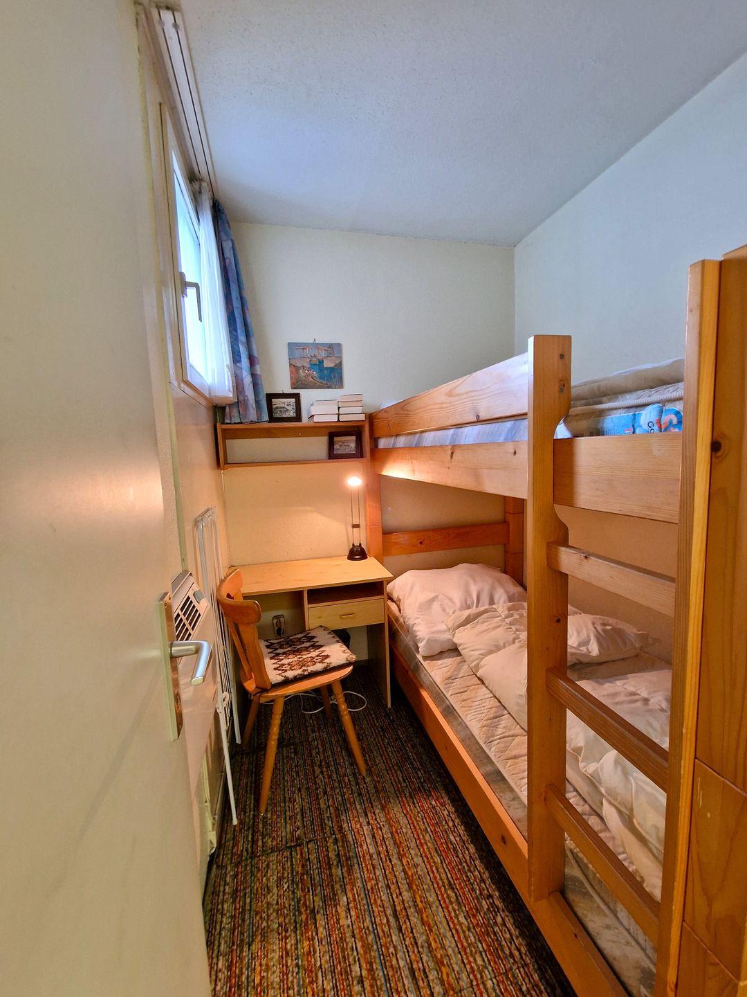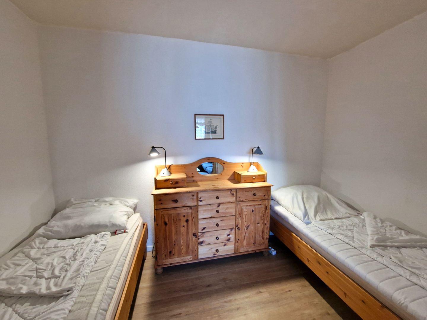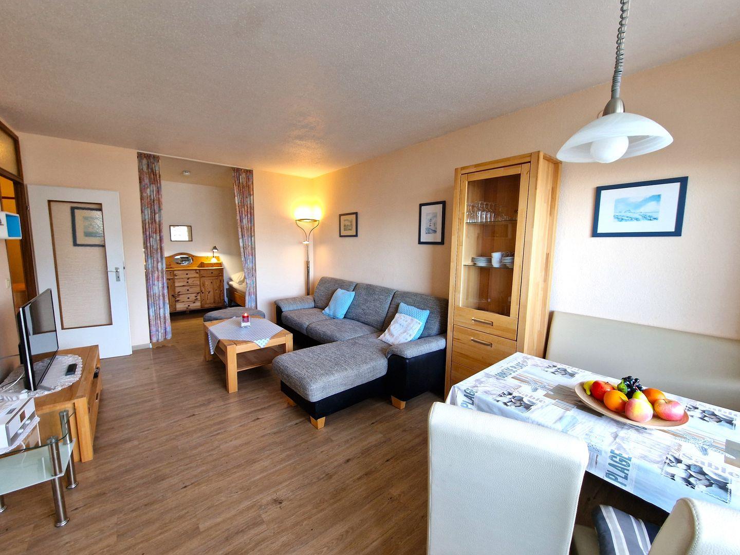 Von dort haben Sie einen schönen Blick über den parkähnlichen Innenhof direkt in Richtung Ostsee. Wohnraum mit einer modernen Couch mit Ottomane und einem Hocker, TV und HiFi-Anlage. Die Essecke befindet sich direkt am Fenster. Schlafbereich mit zwei Einzelbetten und durch Vorhang vom Wohnbereich abgetrennt. Kinderzimmer mit einem Etagenbett. Küche mit 4-Plattenherd und Mikrowelle. DU/WC. Nichtraucher, keine Tierhaltung erwünscht.