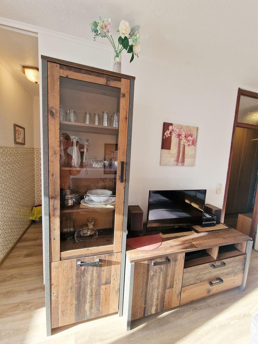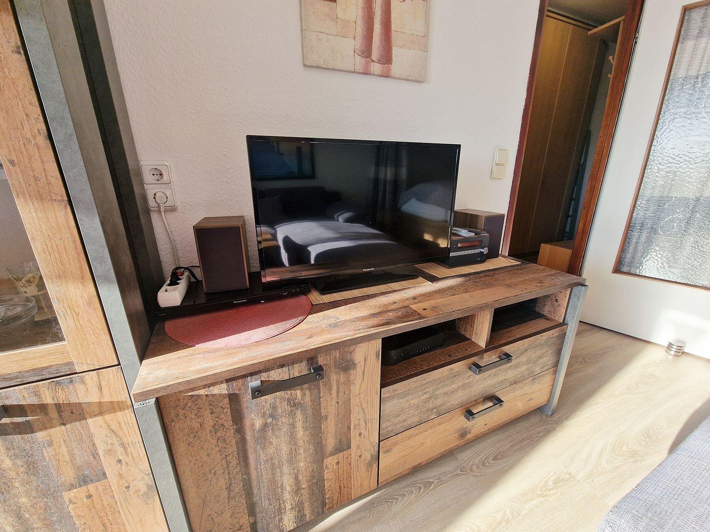 Wohnraum mit einer grau melierten Eckcouch, TV, Radio mit CD und MP3-Player.