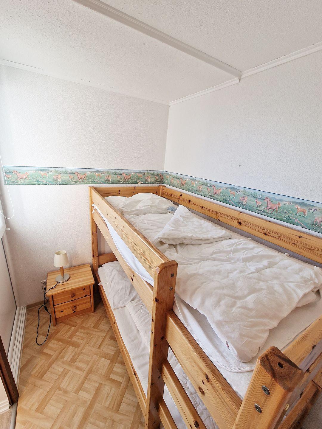 Das freundliche Kinderzimmer ist mit einem 90x200 cm großem Etagenbett ausgestattet.