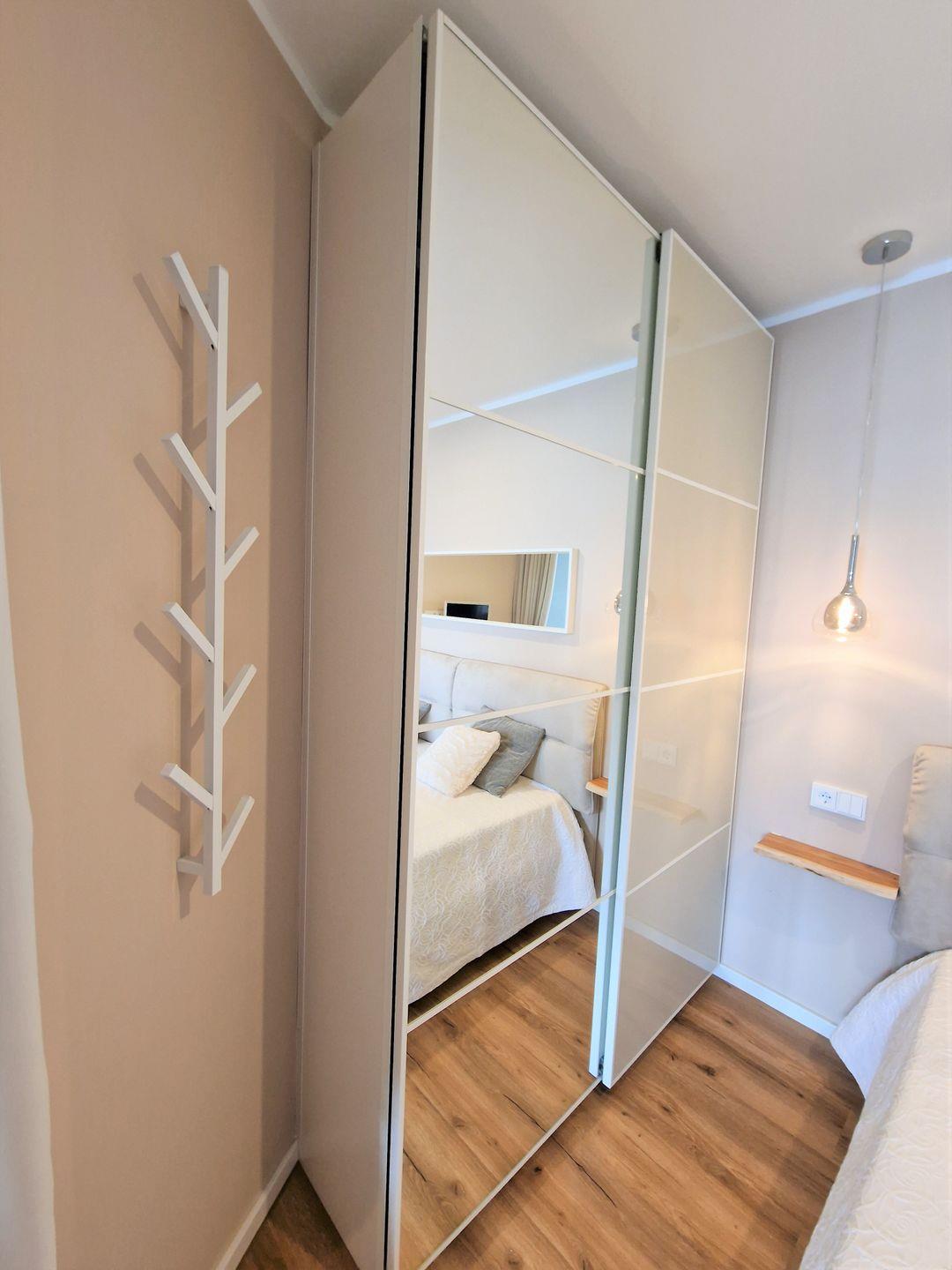 Der Schlafbereich, welcher durch einen Vorhang vom Rest des Raumes teilbar ist, verfügt über ein sehr komfortables Doppelbett inkl. Kleiderschrank und TV-Gerät (24 Zoll).