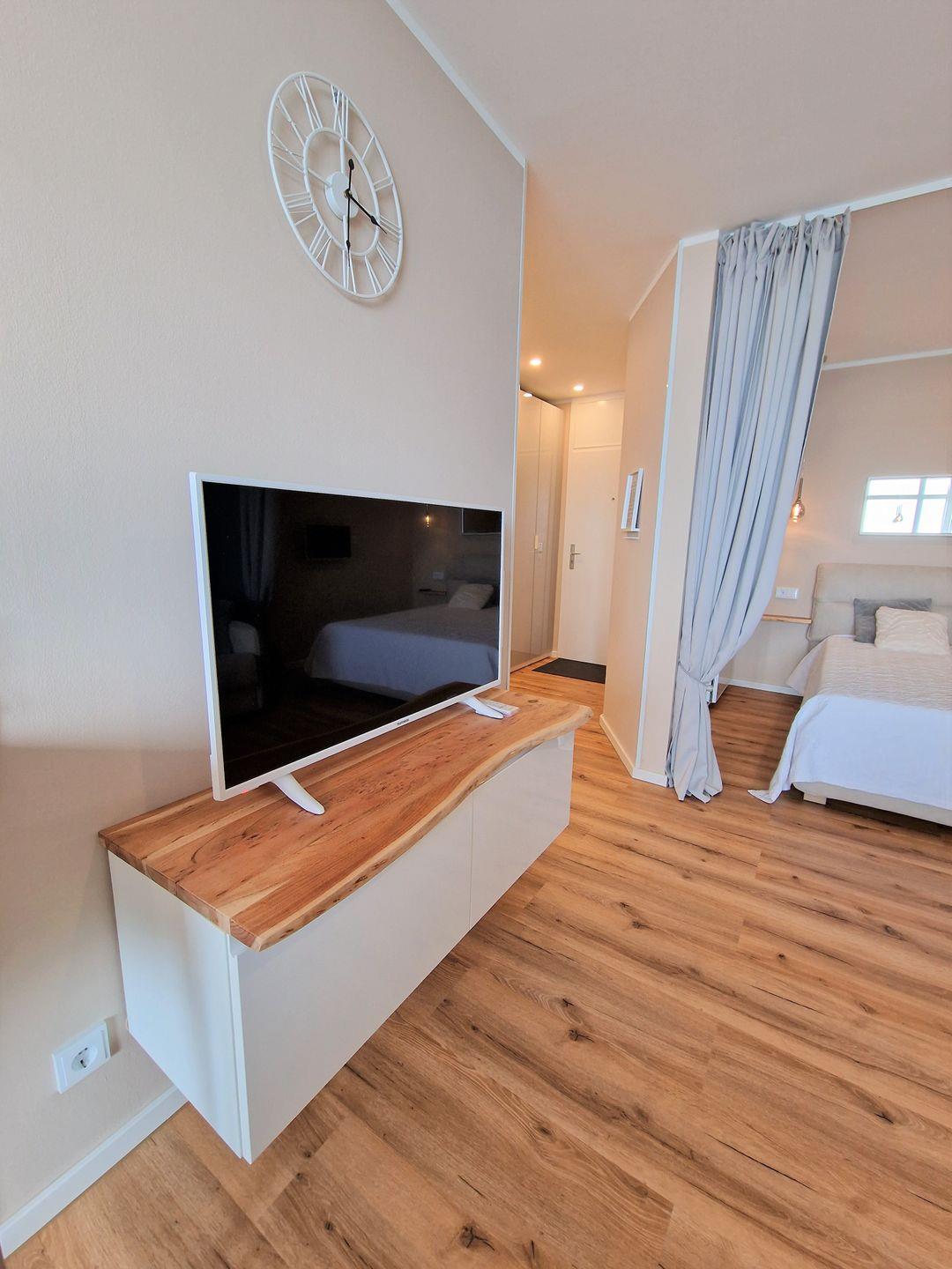 Als Sitzgelegenheiten steht eine gemütliche Couchgarnitur, welche auch als Schlafcouch genutzt werden kann, sowie ein großzügiger Essbereich und ein kleiner Tresen mit 2 Barhockern, zur Verfügung - auch ein großer Flachbild-TV (43 Zoll) ist hier vorhanden.