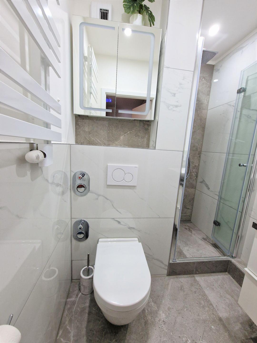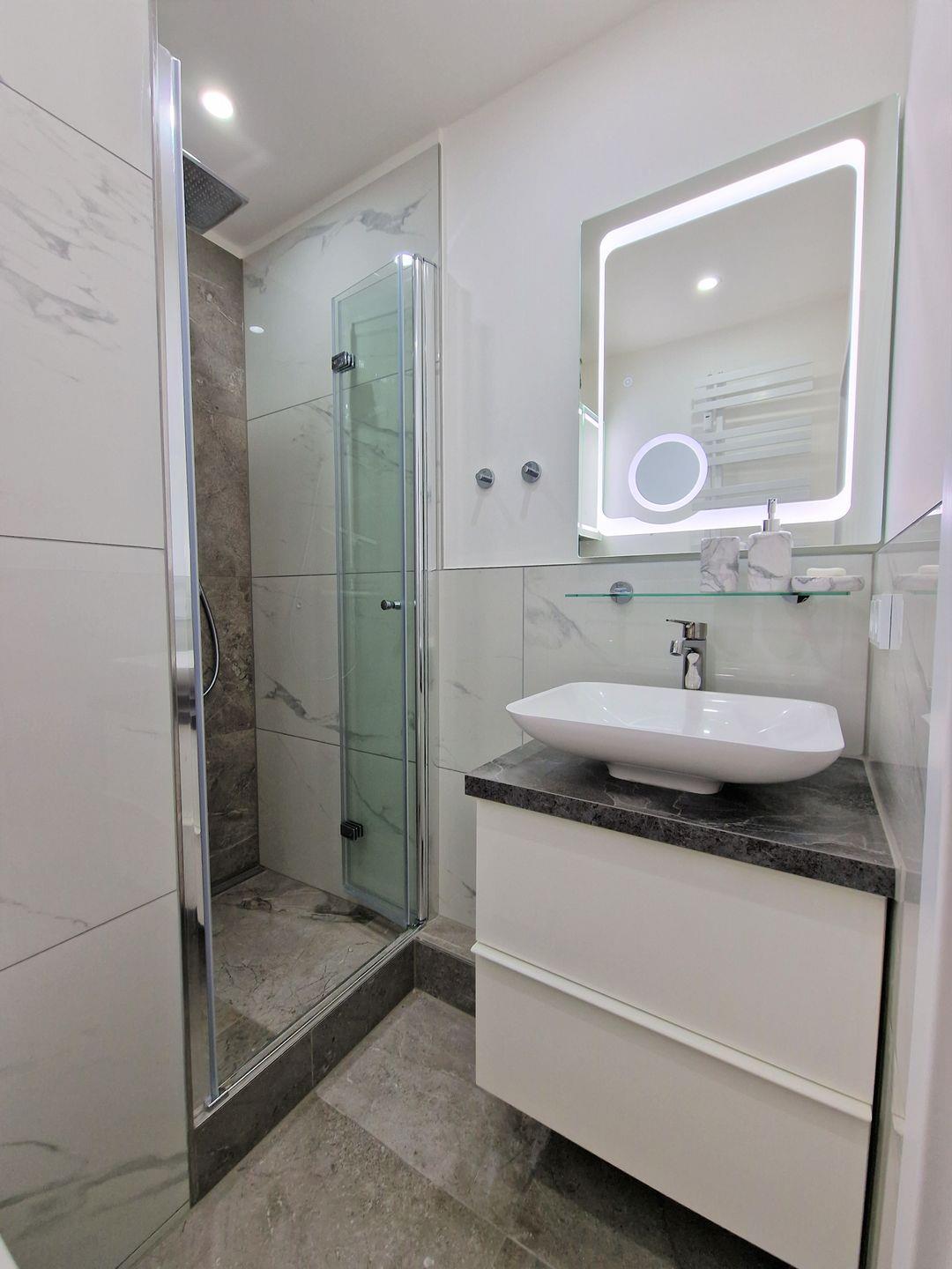 Im hellen Badezimmer mit Glasduschkabine und einem WC mit BD-Funktion erwarten die Gäste ebenfalls kleine Annehmlichkeiten, wie z. B. ein beheizbarer Spiegel oder ein moderner Handtuchheizkörper.