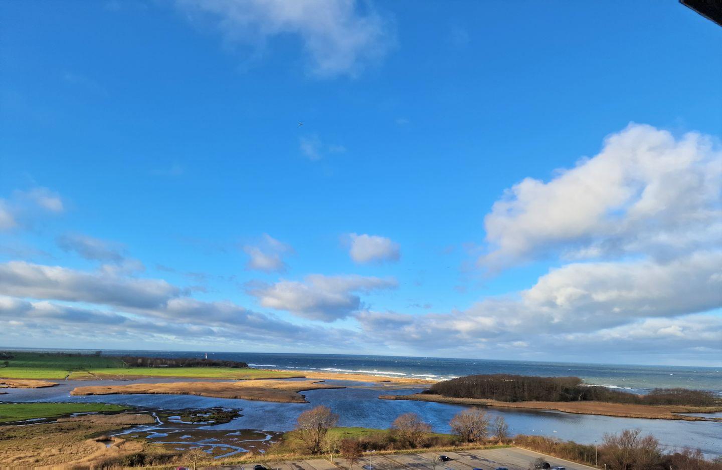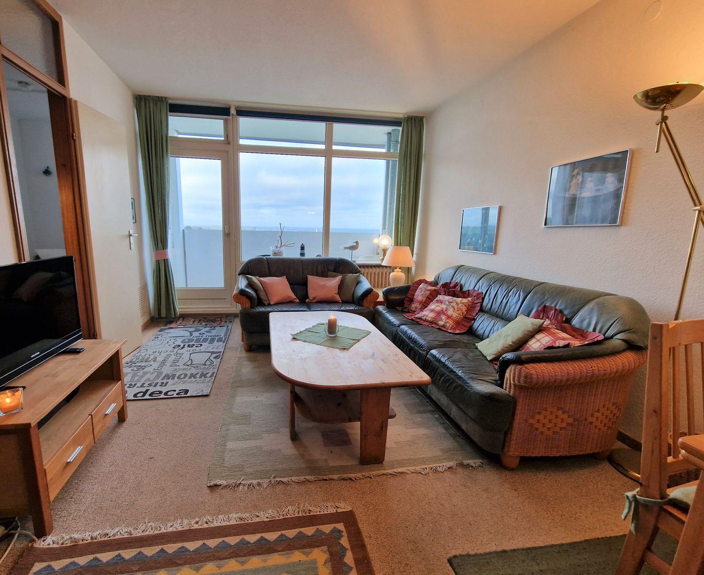 Schöne, gemütliche Ferienwohnung in der 10. Etage mit Balkon zur Westseite und Ostseeblick Richtung Leuchtturm und Steilküste.