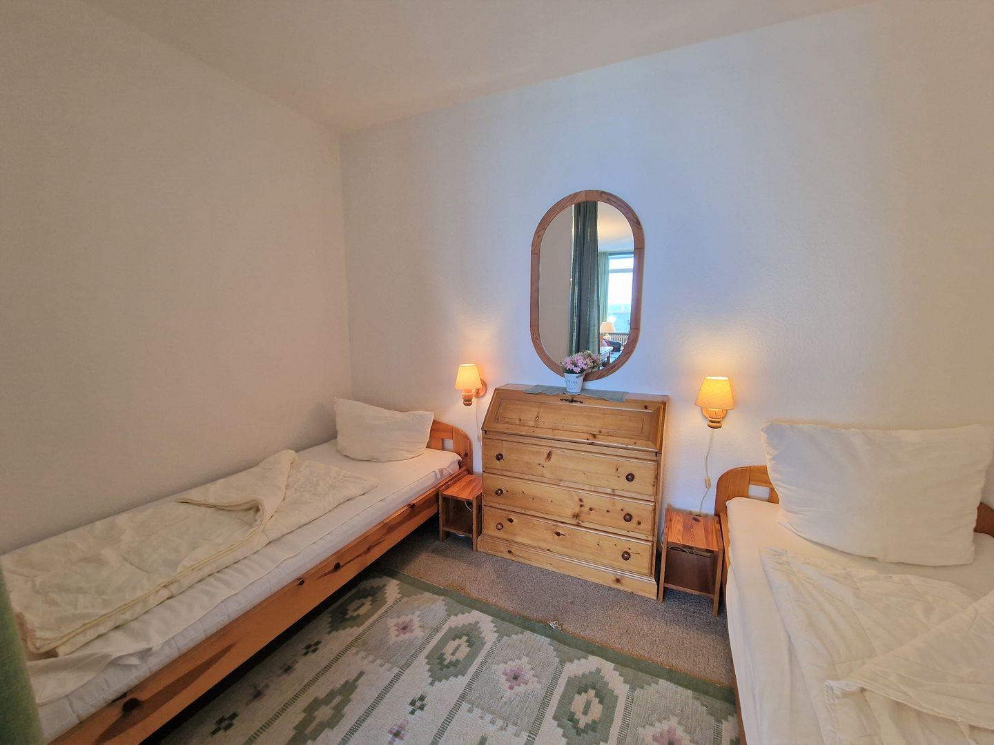 Schlafbereich mit zwei Einzelbetten und durch Vorhang zum Wohnbereich abtrennbar. Kinderzimmer mit einem Einzelbett (ca. 2,00 m).
