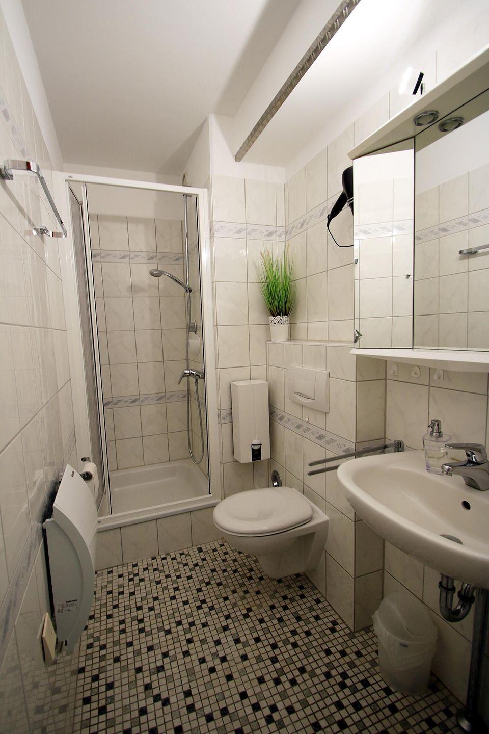 Schönes Badezimmer mit Duschkabine und WC.