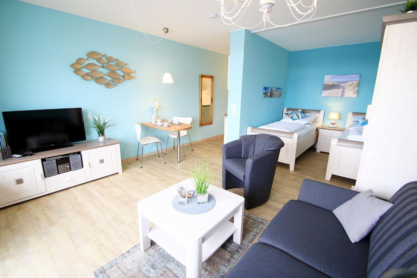 Wohnbereich mit 2er Schlafcouch und Sessel, großem LCD-TV und integrierter Essecke. Schlafbereich in einer Nische mit 2 Einzelbetten (90 x 200cm).