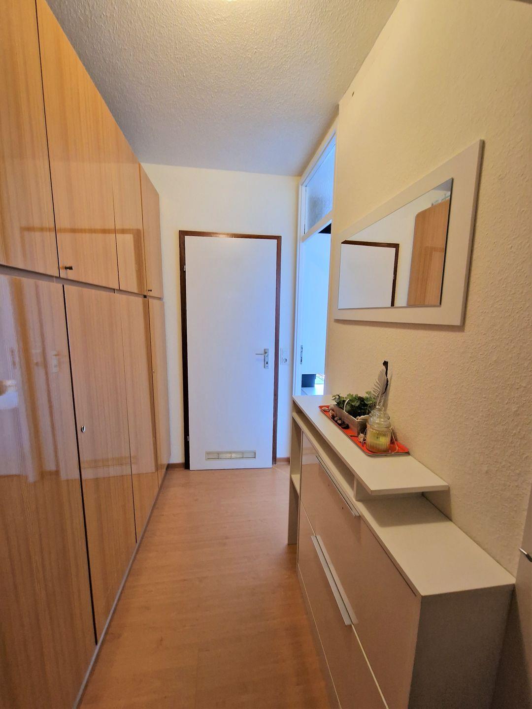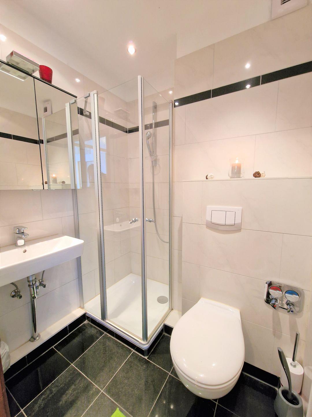 Das Bad ist frisch saniert und verfügt über eine Duschkabine, ein Hänge-WC sowie einen modernen Handtuchheizkörper.