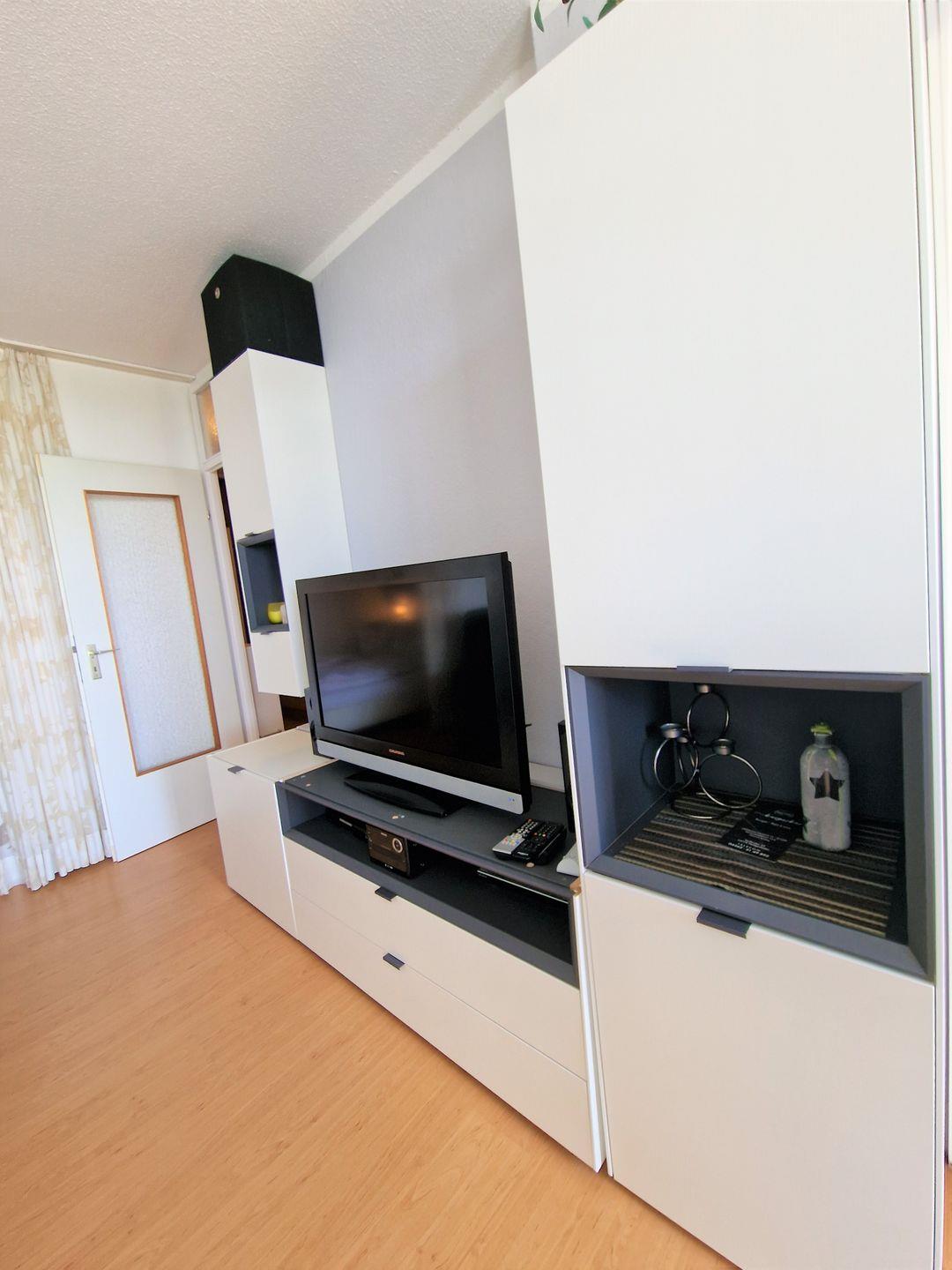 Wohnbereich mit bequemen und wertigen Sitzgelegenheiten und Flachbild-TV; Essecke direkt am Fenster.