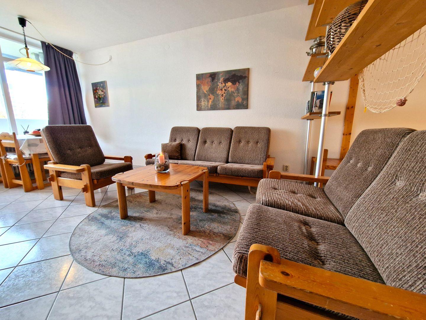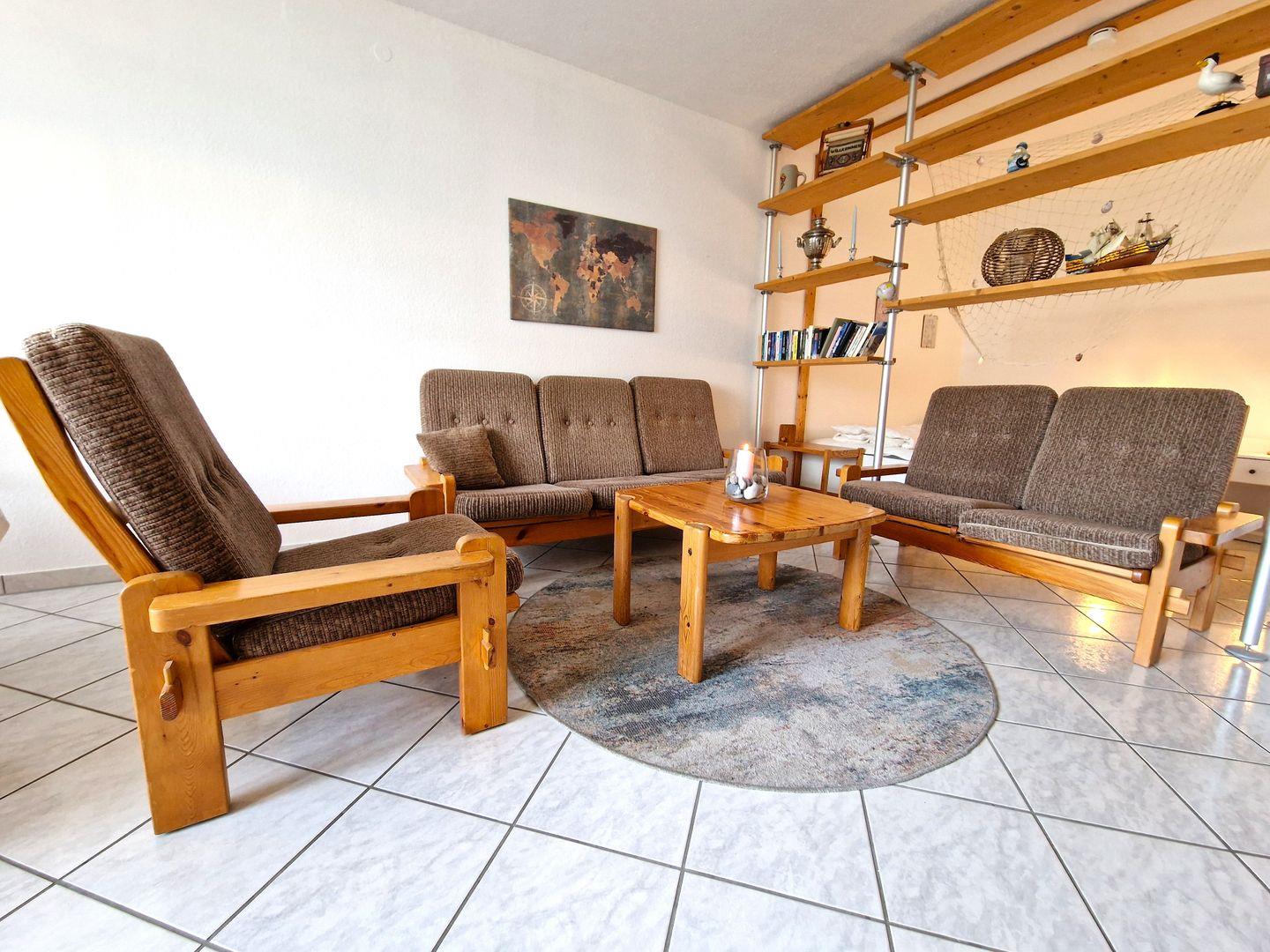 Wohnraum mit einer 3er,2er Couch und 1 Sessel, LCD-TV und DVD.
