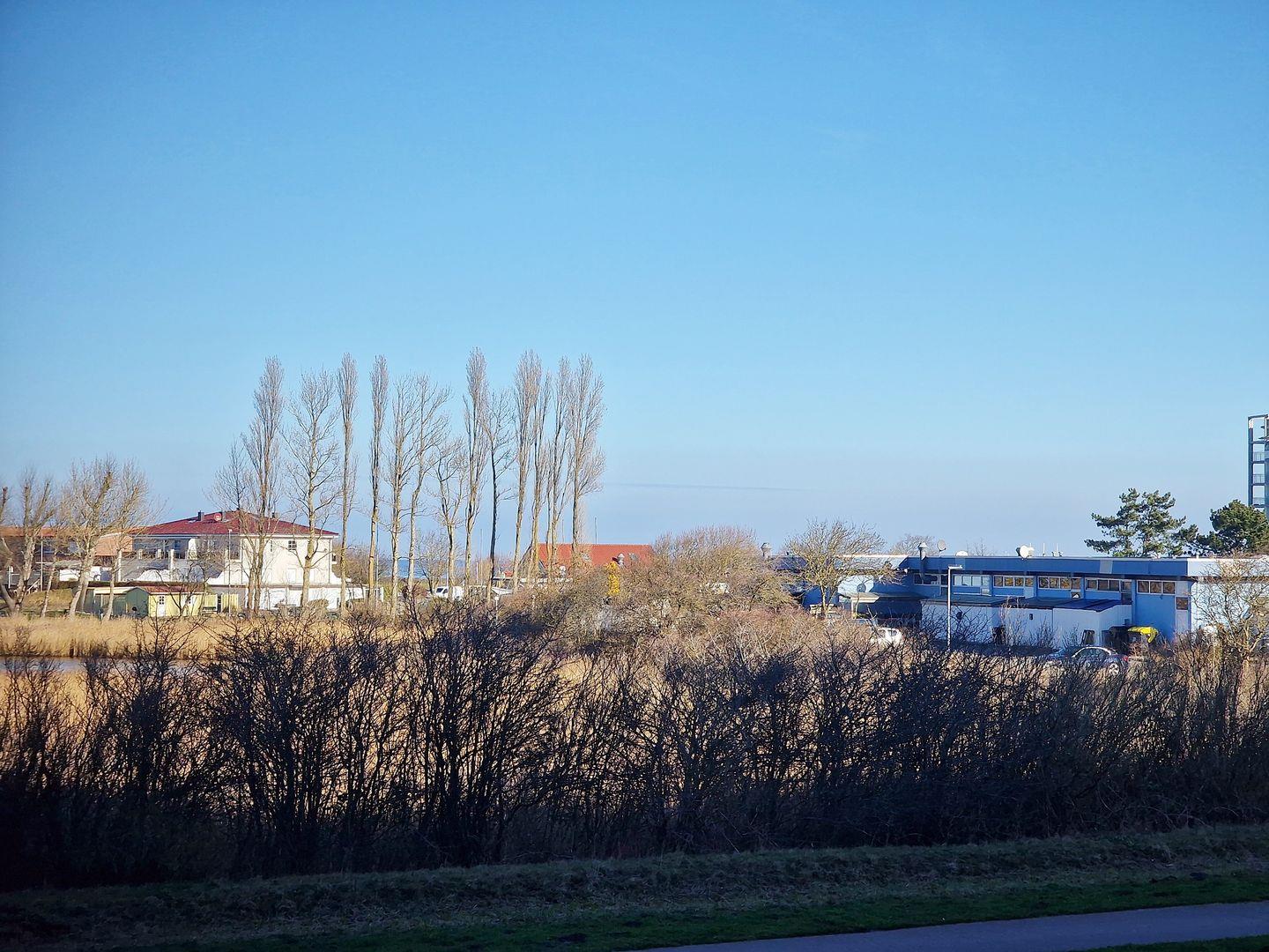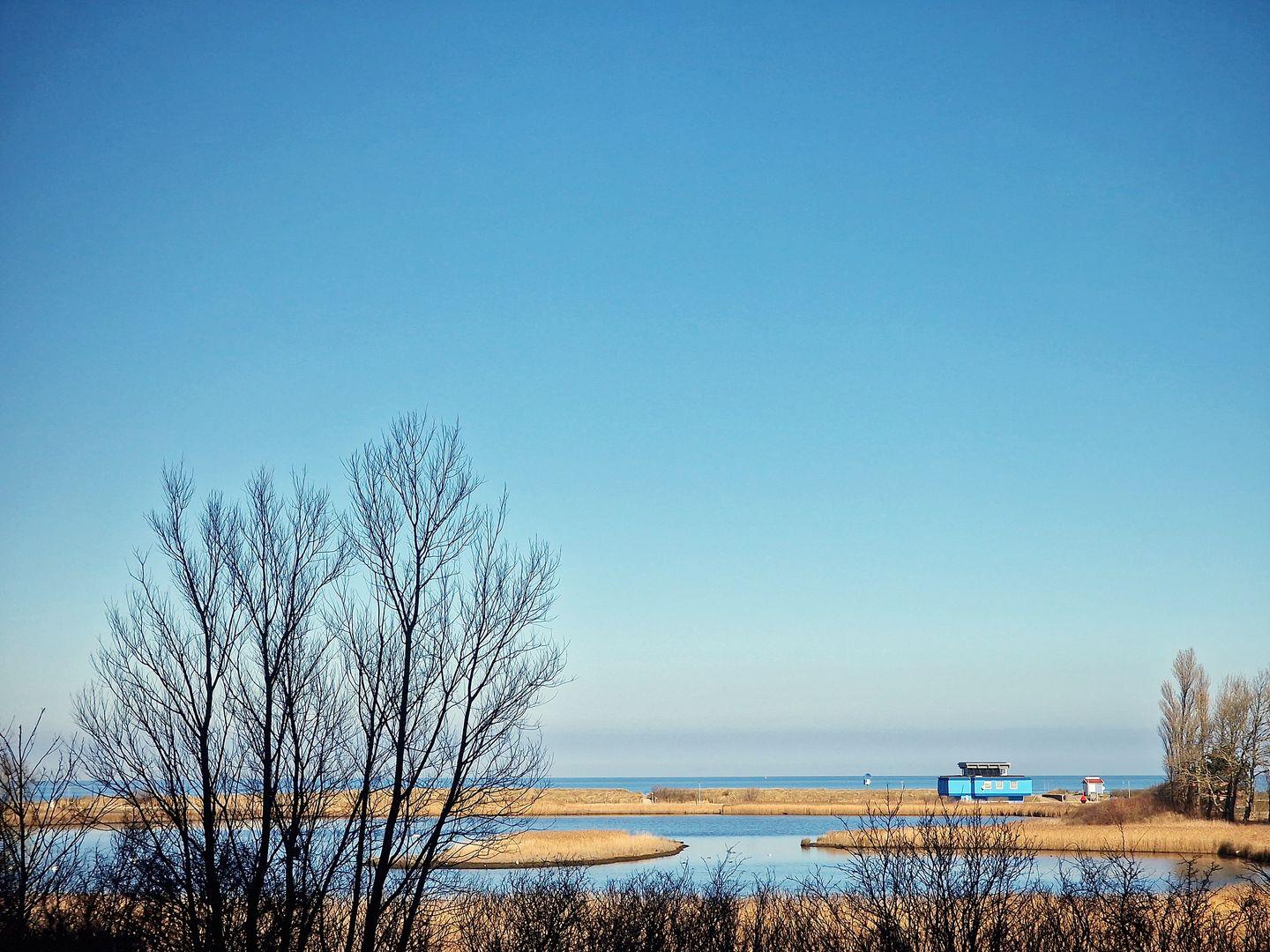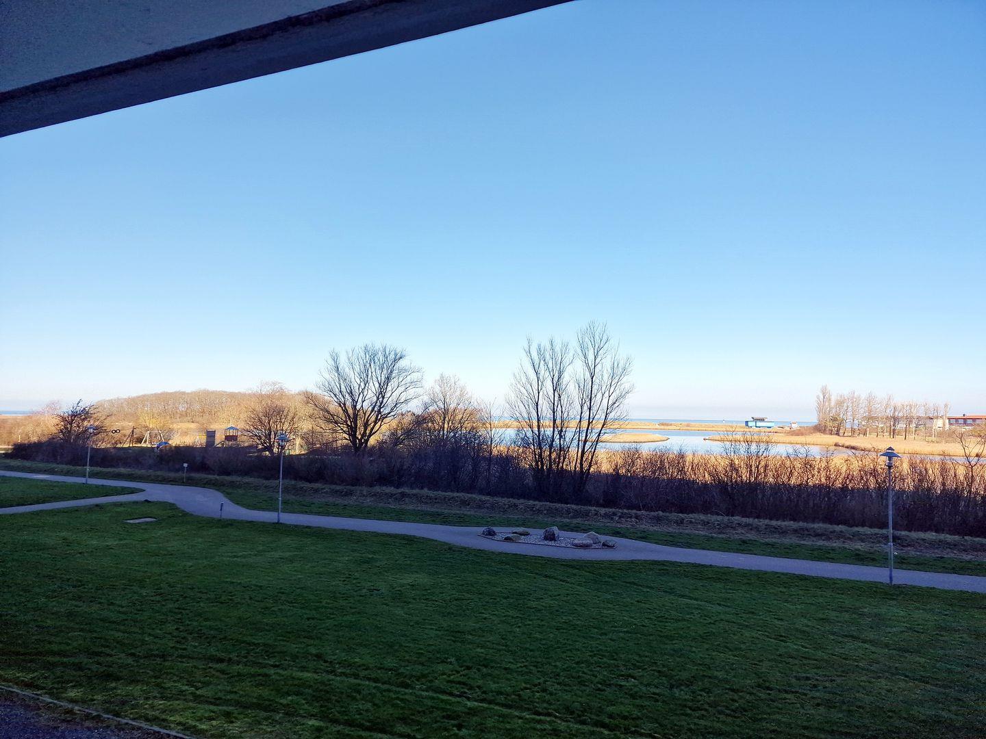 Vom Wohnbereich heraus, erreichen Sie den möblierten Nord-Balkon und genießen den Blick aus dem 1. Stock auf Salzwiesen und Ostsee.