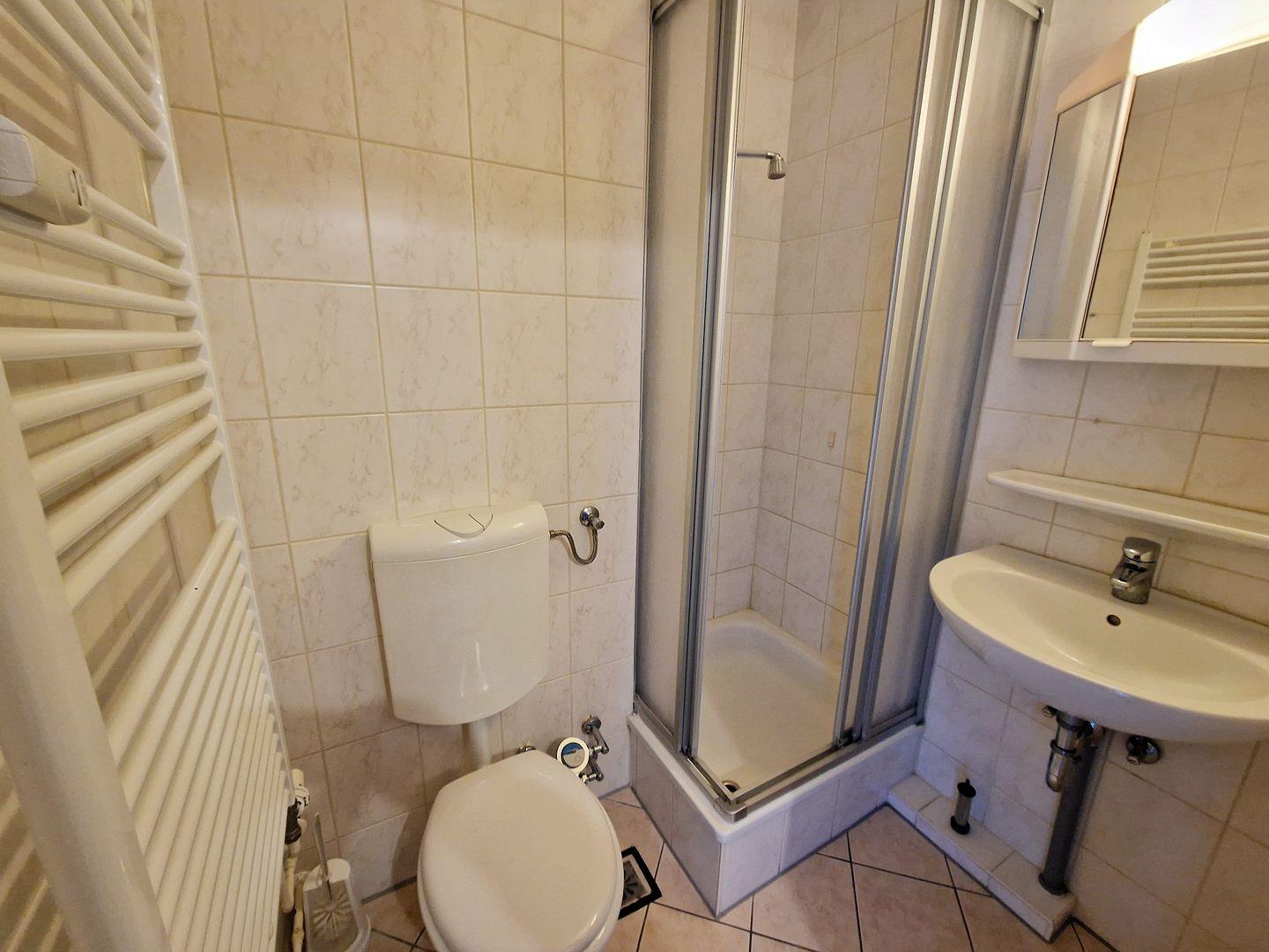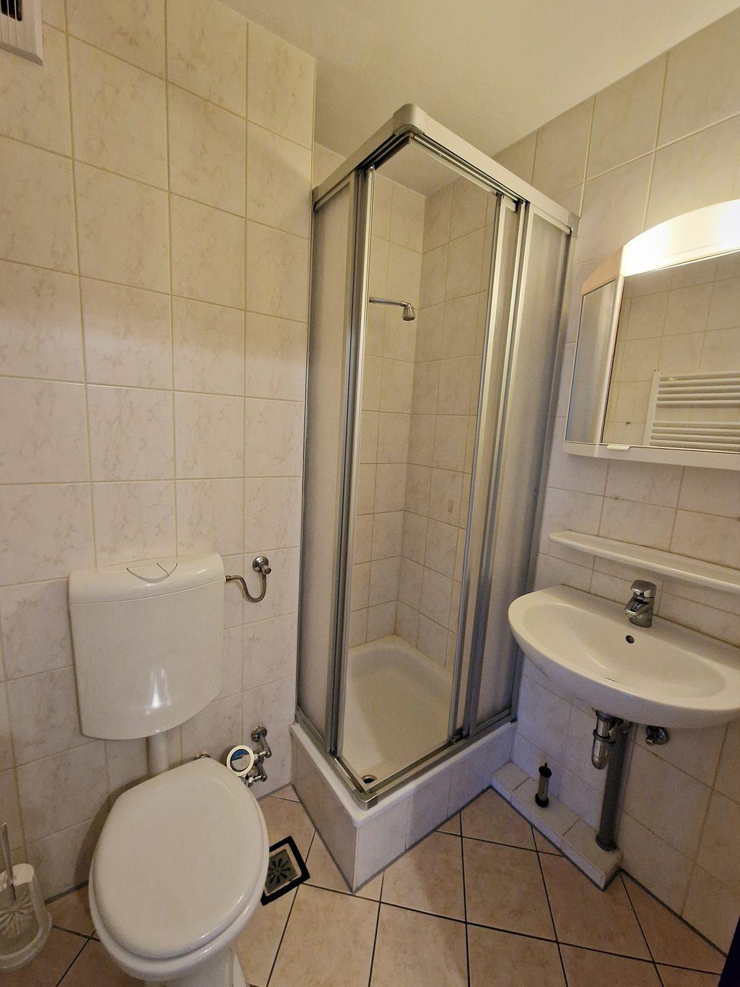 Im separatem Badezimmer befindet sich ein WC, Duschkabine (Einstieg hoch), ein Waschbecken, ein Spiegelschrank und eine Heizung mit Handtuchhalterfunktion.