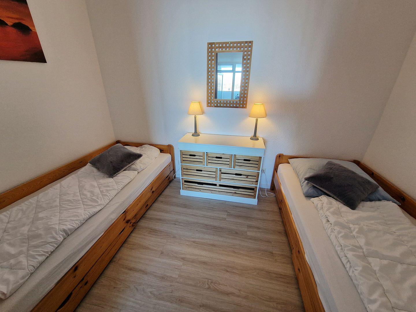 Vom Wohnbereich (durch einen Verdunklungsvorhang separiert getrennt), finden Sie das Schlafzimmer. Hier stehen Ihnen zwei Einzelbetten und eine Kommode mit Nachttischlampen für ruhige Urlaubsnächte zur Verfügung.