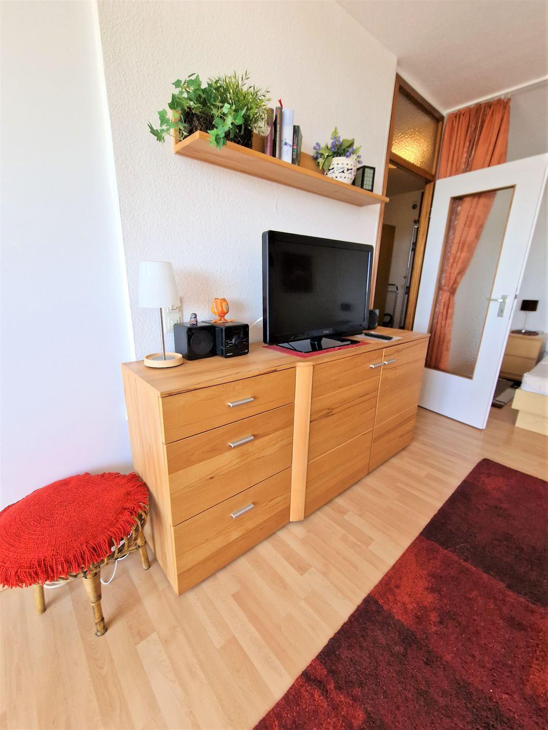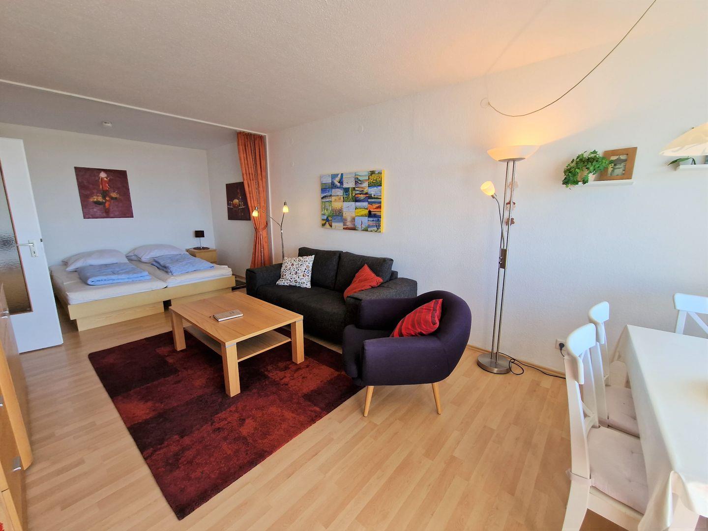 Wohnbereich mit 3er Couch und Sessel, TV und Musikanlage mit CD u.USB. Die Essecke befindet sich direkt am Fenster- Sie geniessen beim Essen den Weitblick.