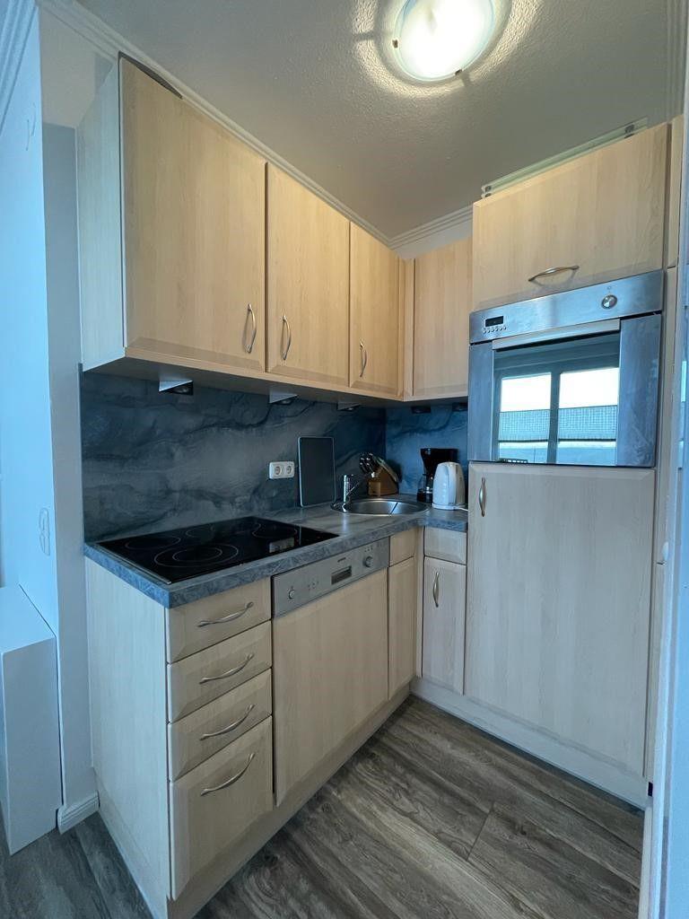 Die kleine, an den Wohnbereich angrenzende Küchenzeile wurde umfassend mit Geschirrspüler, 4-Feld-Ceranherd, Backofen, Kühlschrank mit Gefrierfach, Spüle und allen notwendigen Kochutensilien und Geschirr ausgestattet. Gleich neben der Küche nehmen Sie Ihre gemeinsamen Mahlzeiten am runden Esstisch mit Blick auf Binnengewässer und Meer ein.