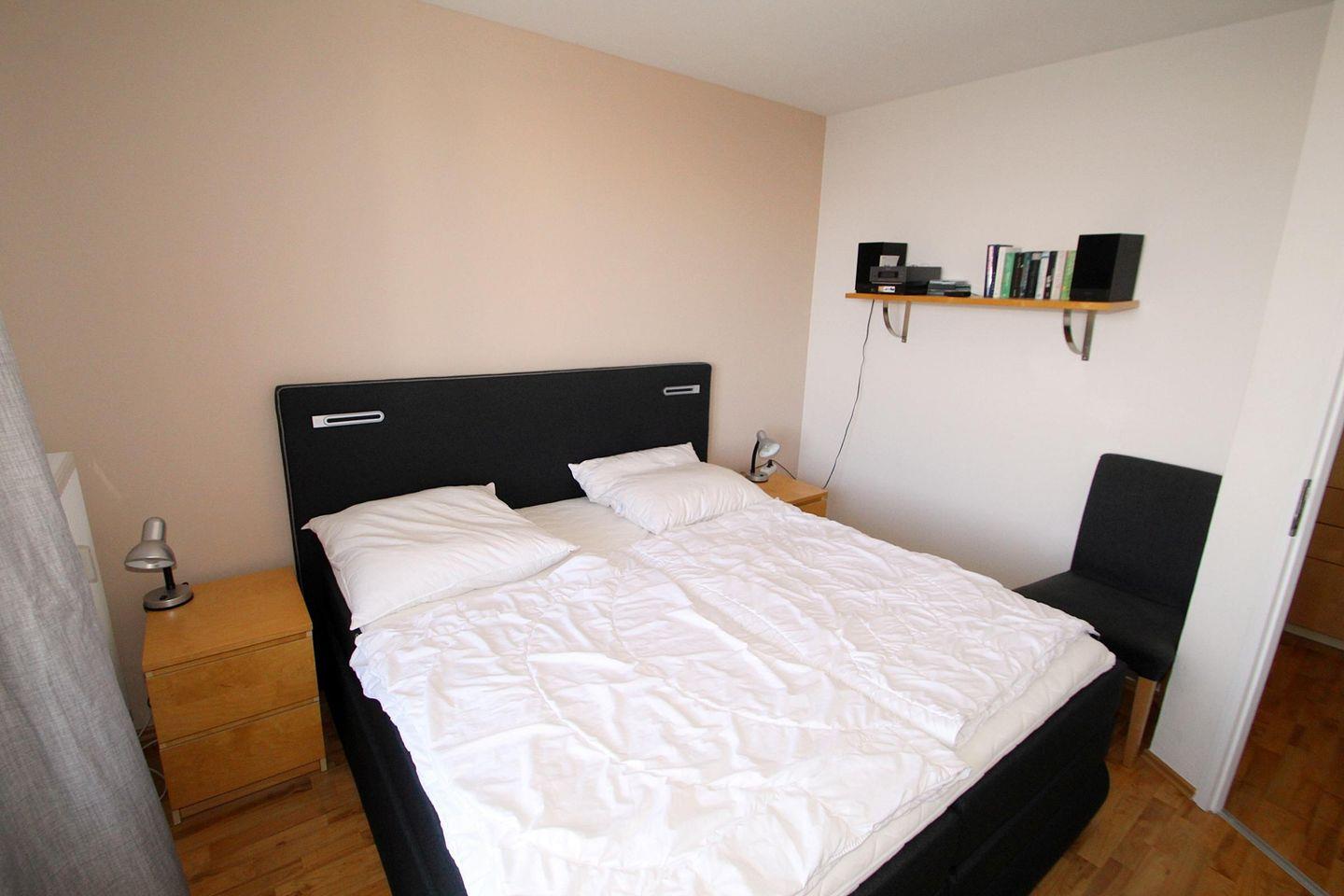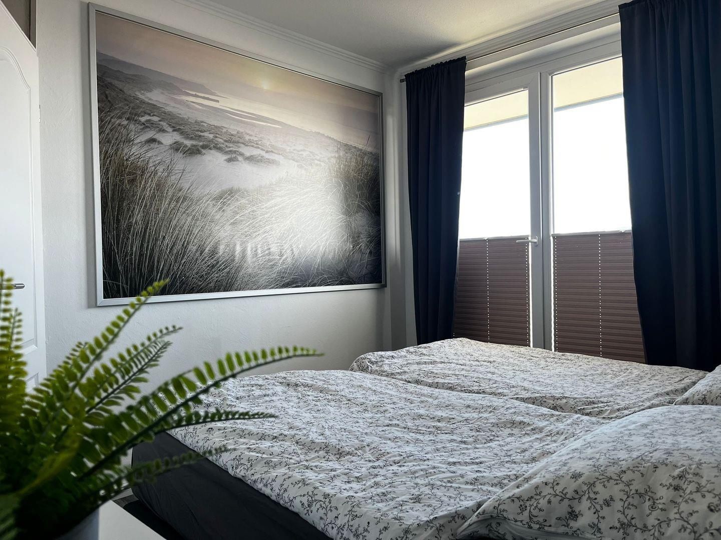 Die Wohnung verfügt über zwei separate Schlafzimmer für entspannte Urlaubsnächte: Im größeren Schlafzimmer stehen ein modernes Boxspringbett (180*200cm), Nachtschränke und eine Kommode bereit. Der Zugang zum Balkon über eine Doppel-Terrassentür wird bei Bedarf durch hochwertige Plissees und zusätzliche Vorhänge verdunkelt. Bücher und Kompaktanlage stehen zu Ihrer Unterhaltung zur Verfügung.