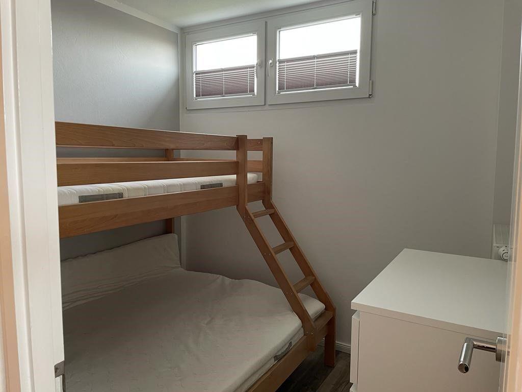 Im zweiten Schlafzimmer finden Sie ein Massivholz-Etagenbett mit unterschiedlich breiten Schlafgelegenheiten (90*200cm und 140*200cm) sowie eine Kommode. An den beiden Oberlichtern sind für einen ungestörten Schlaf ebenfalls Plissees angebracht.