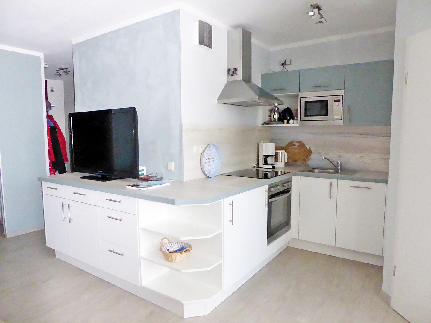 Die offene Küche ist mit Mikrowelle und Geschirrspülmaschine ausgestattet.