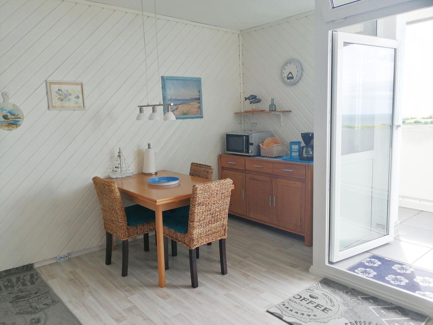 In unserer hellen, modernen Ferienwohnung mit Laminatboden, Vollholz-Möbeln und einer zusätzlichen, erhöhten Essgruppe vor dem Fenster,
