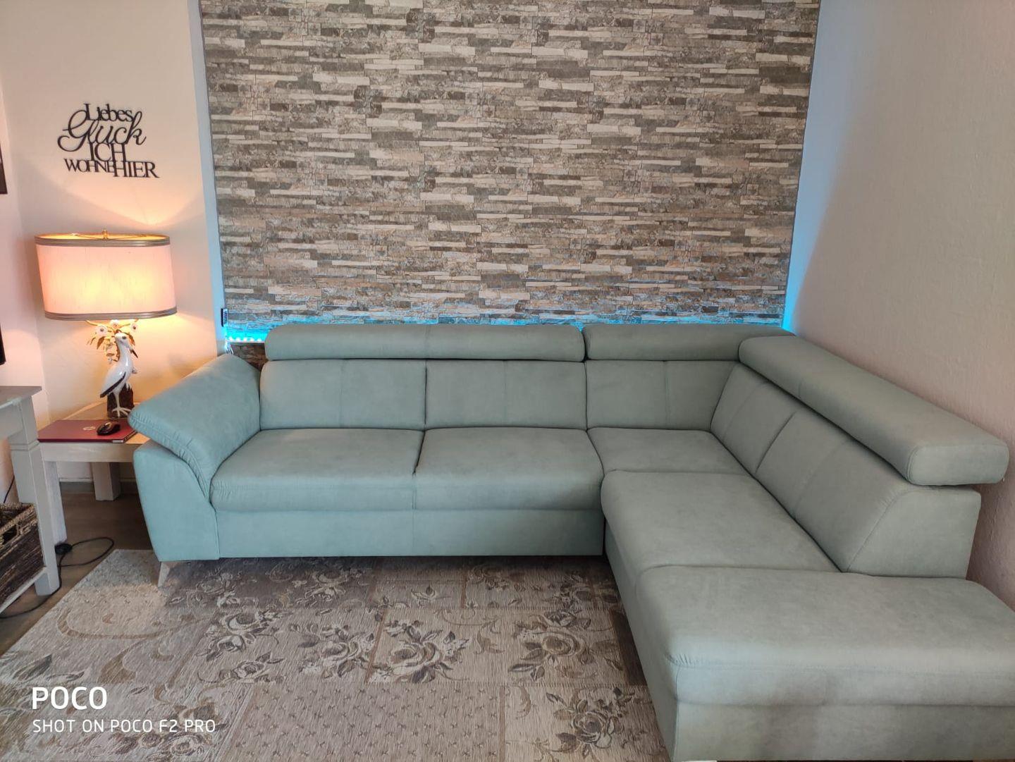 Das gemütliche Wohnzimmer ist mit einer Couch in L-Form und einem Essbereich ausgestattet.