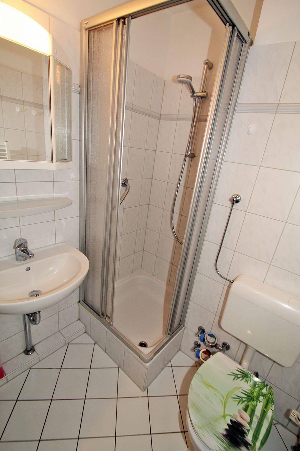 Das helle Bad ist mit einer Duschkabine ausgestattet.