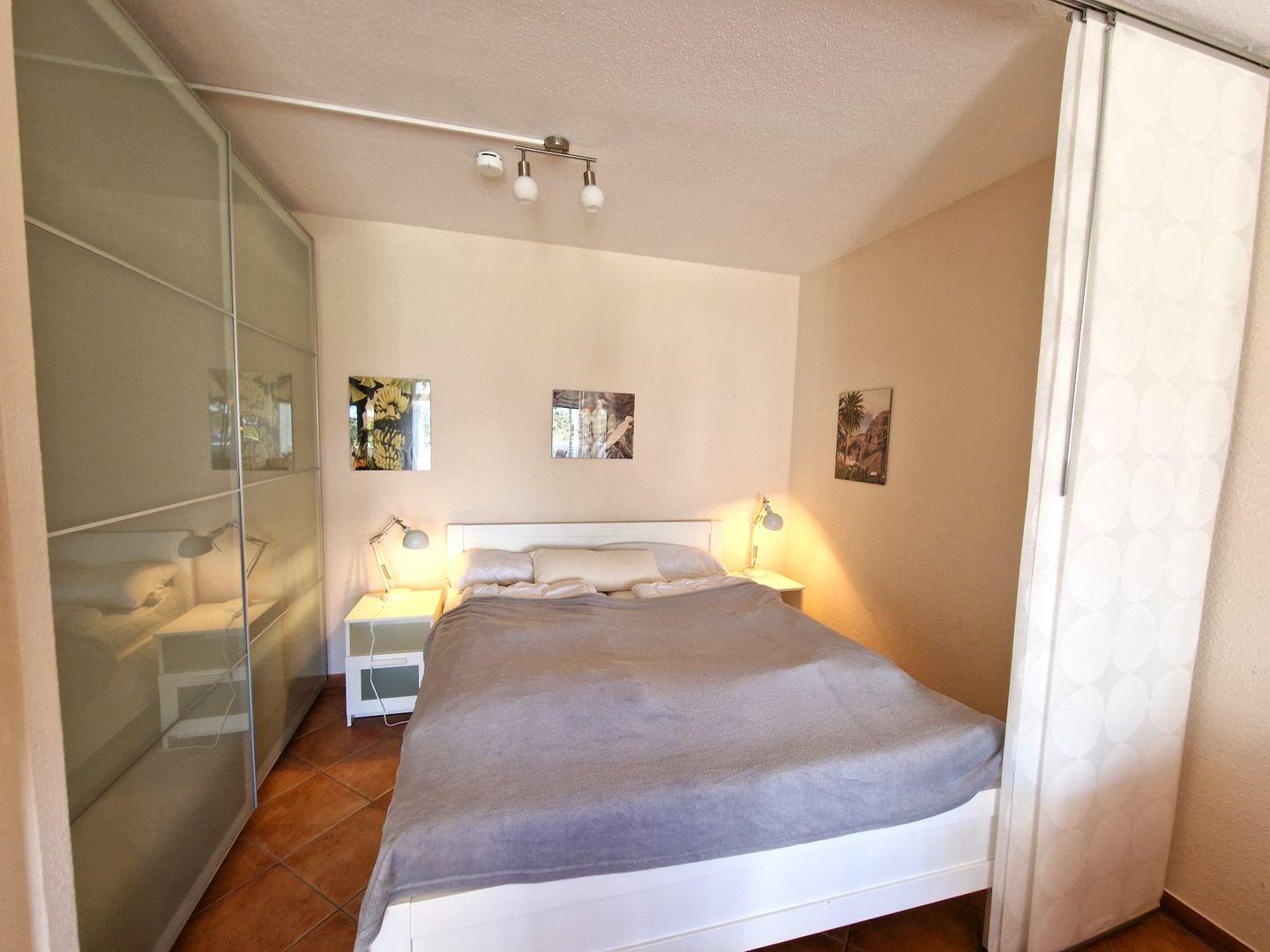 Der Schlafbereich mit Doppelbett (1,6 x 2 m) und Kleiderschrank ist mit Flächenvorhang vom Wohnzimmer getrennt.
