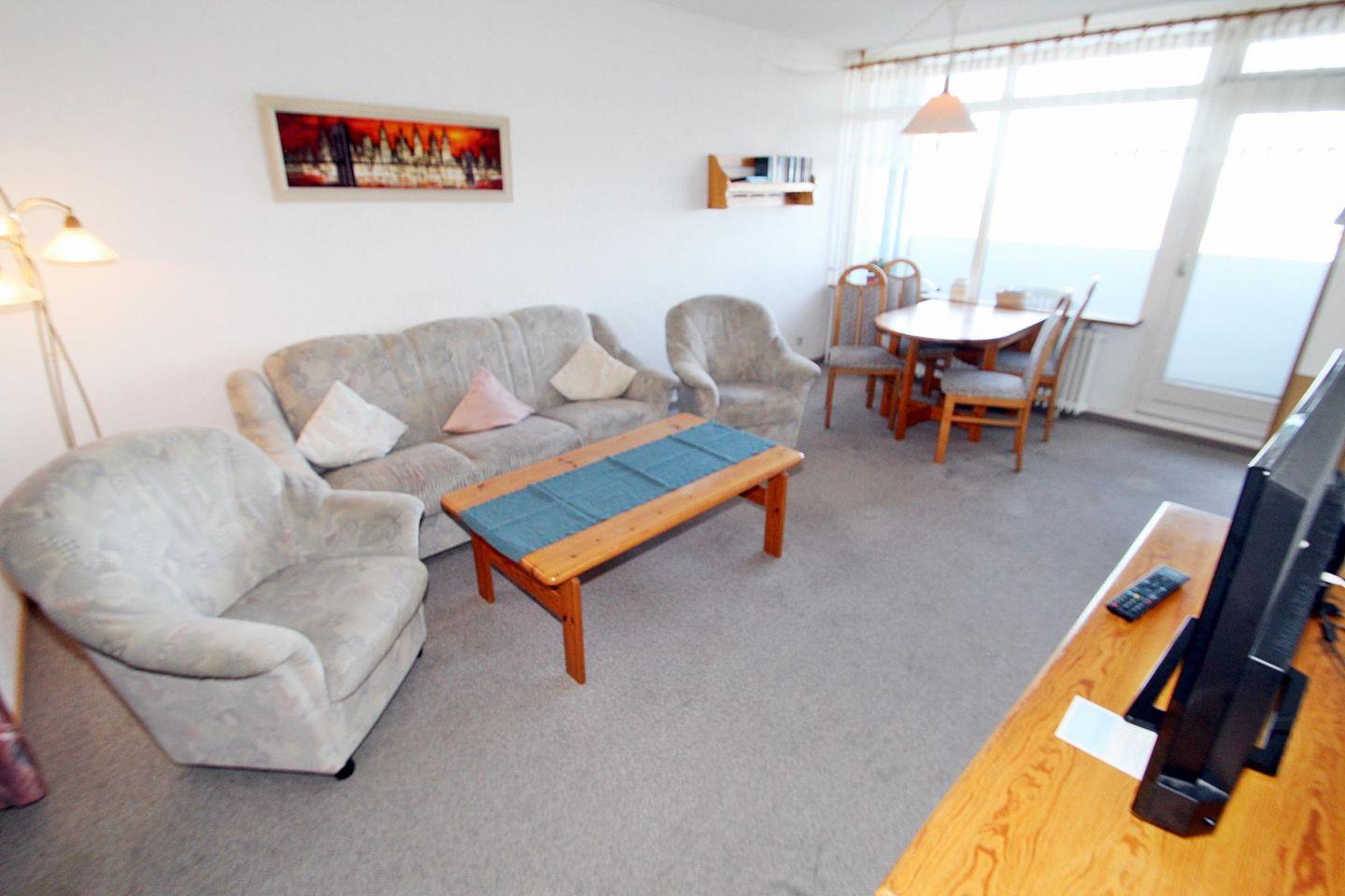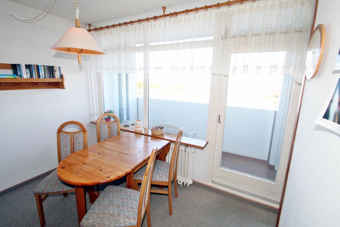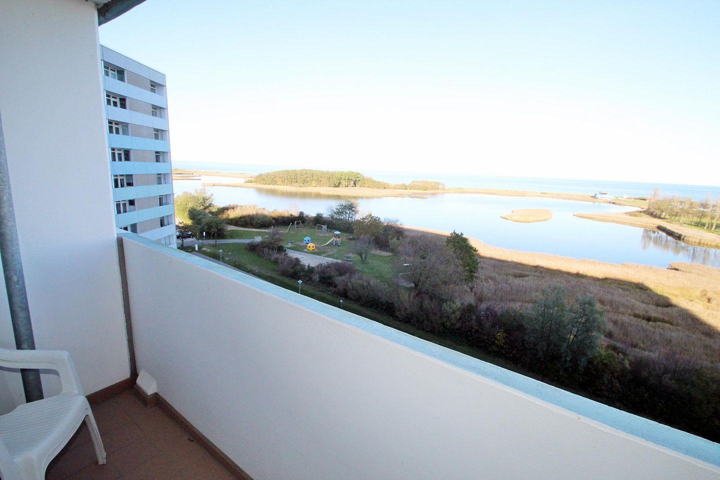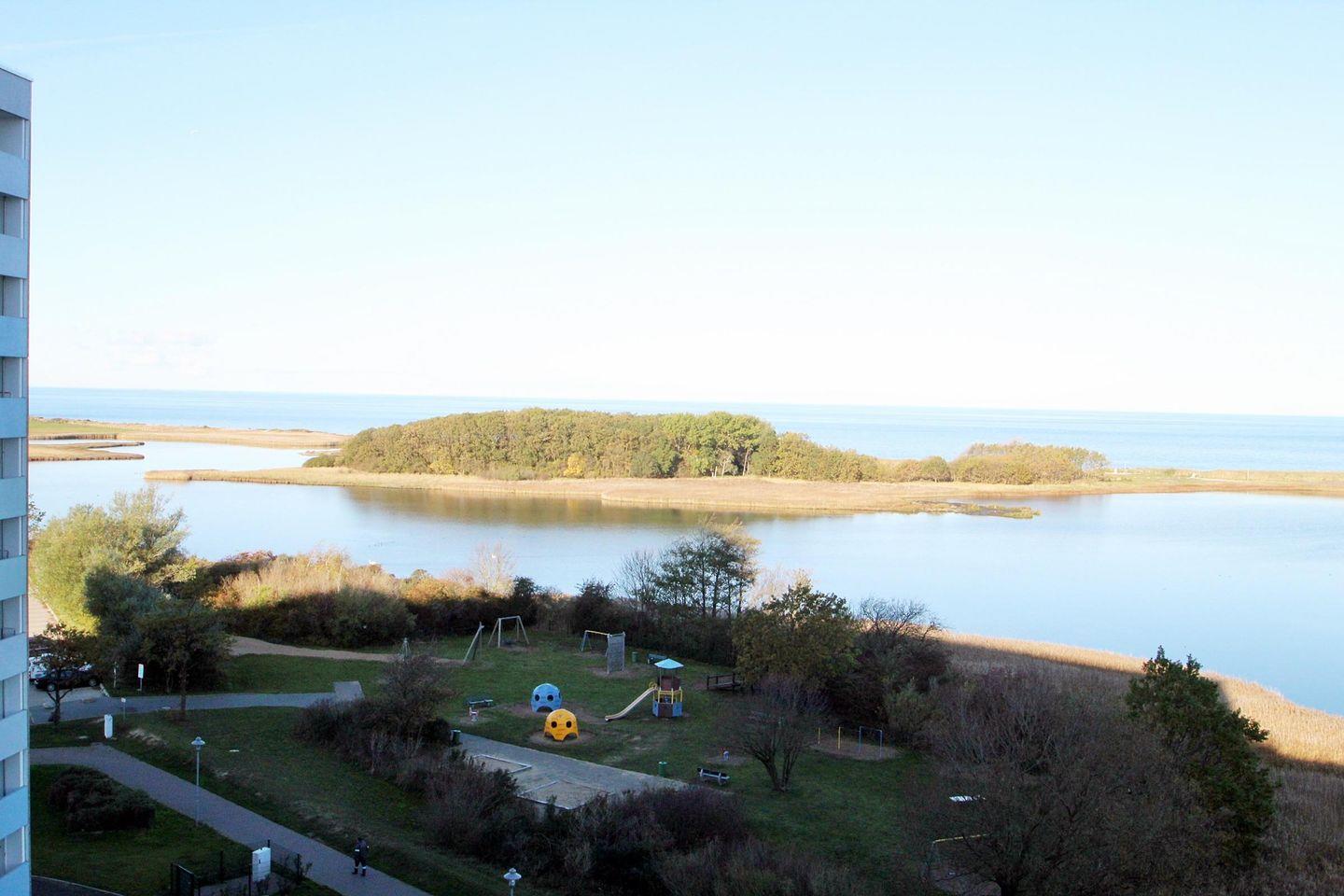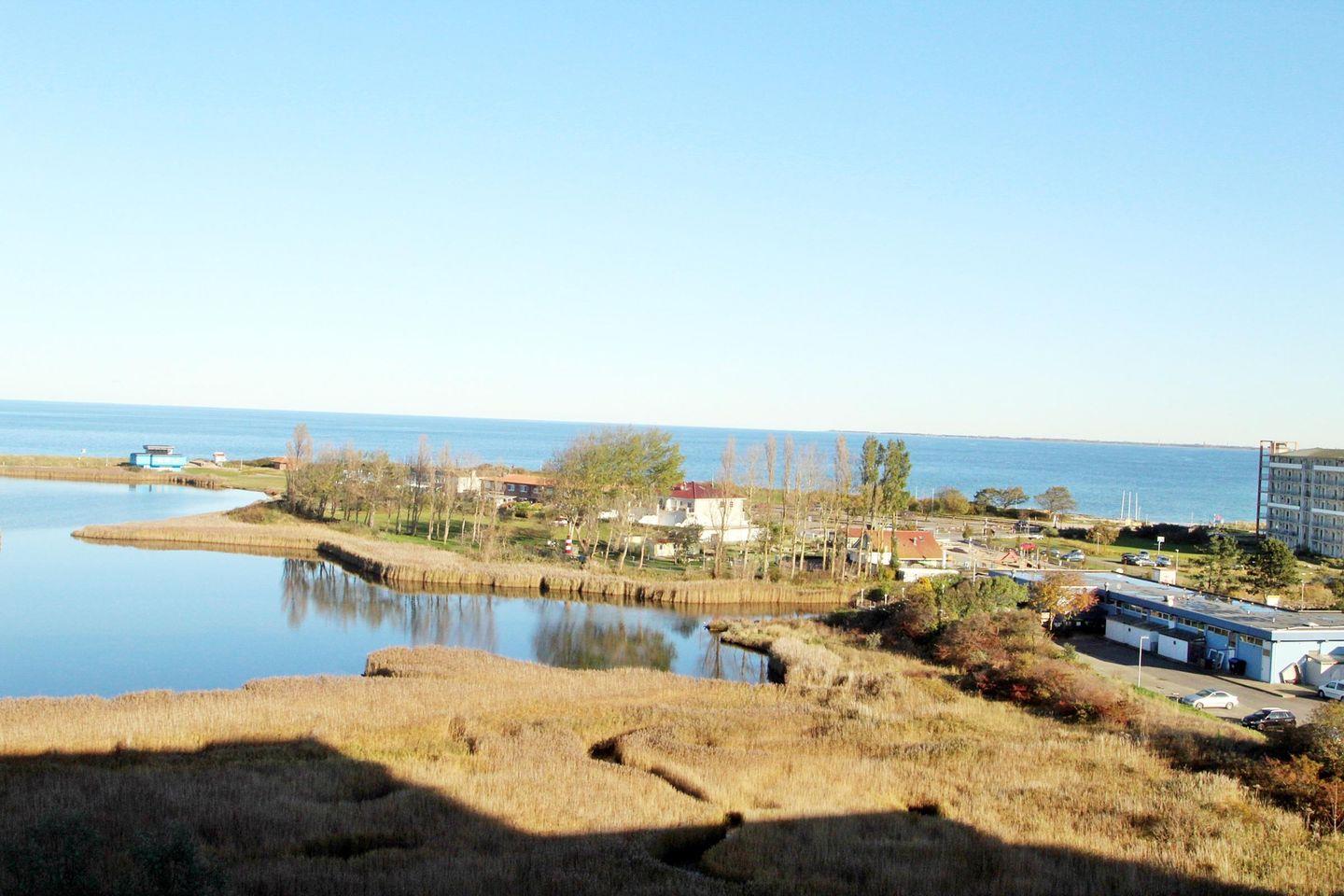 Helle Ferienwohnung in der 7. Etage mit Blick Richtung Insel Fehmarn über die Salzwiesen und Ostsee.