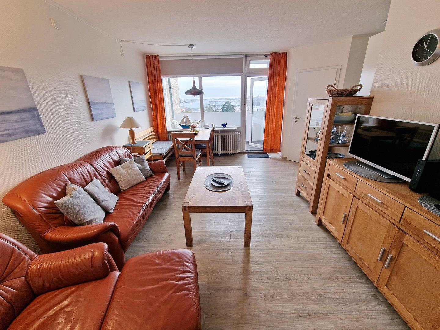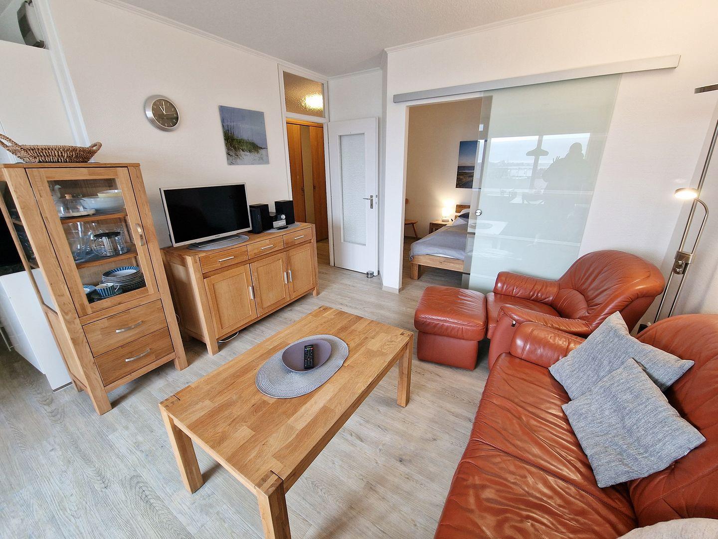 Die Ferienwohnung verfügt über ein einladendes Wohnzimmer mit einer Sofaecke und einem Essbereich, der Ihnen genügend Raum zum Entspannen und gemeinsamen Essen bietet. Hier können Sie gemütliche Abendessen genießen oder sich nach einem Tag am Strand zurücklehnen. Die Kochnische ist funktionell ausgestattet mit einem Cerankochfeld, einem Kühlschrank mit Gefrierfach, einer Mikrowelle, einer Spülmaschine sowie nützliche Küchenutensilien, damit Sie auch im Urlaub Ihre Mahlzeiten selber zubereiten können.