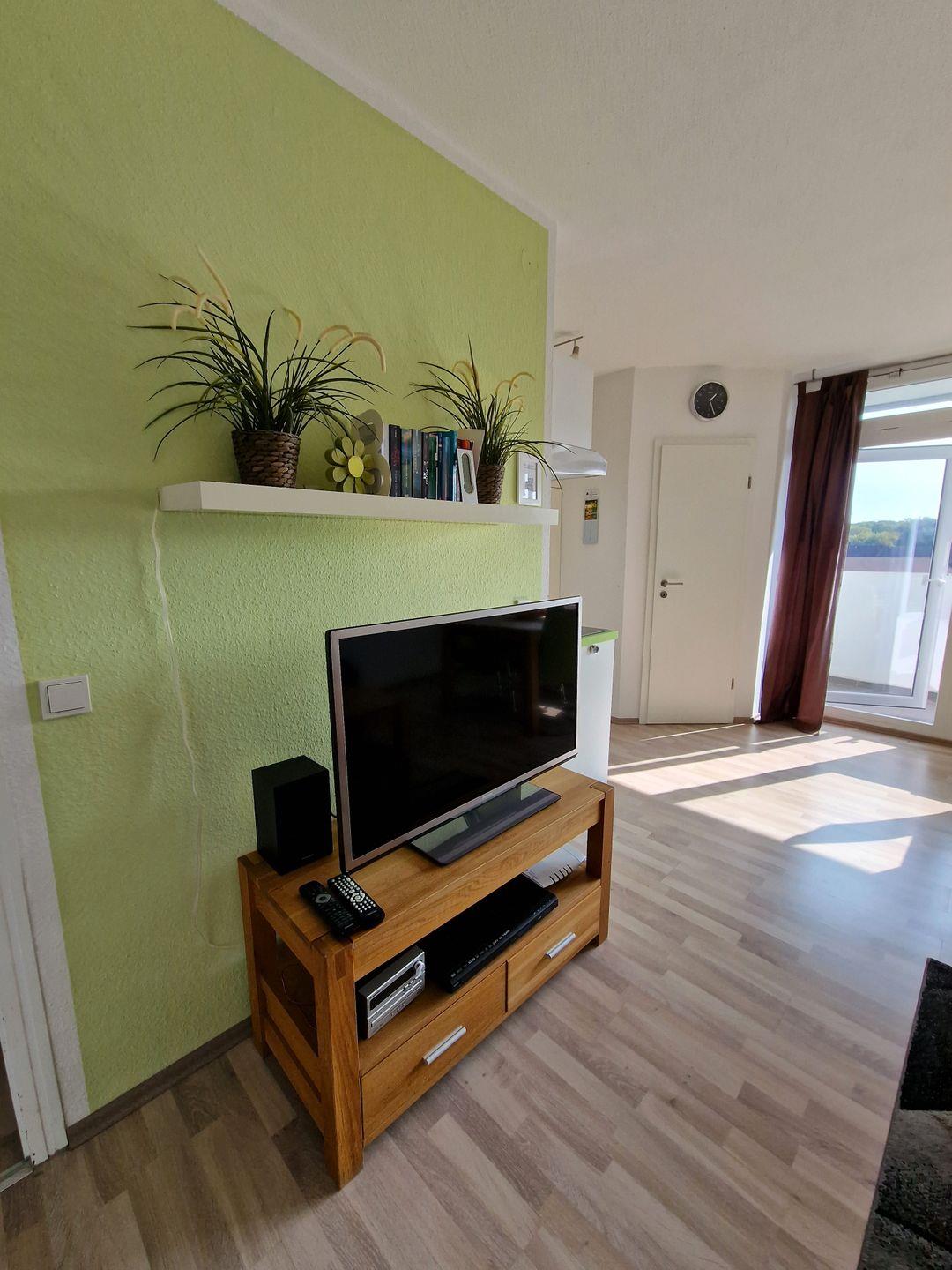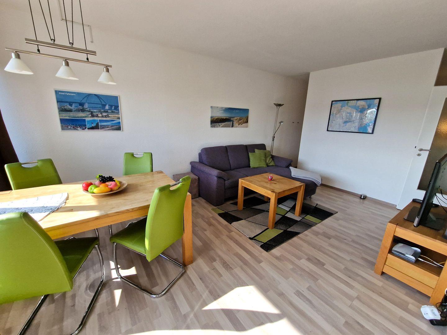 Im schönen Wohnraum kann die gemütliche Couchecke mit Flachbild-TV sowie DVD-Player und Radio mit CD und die Sitzecke am Fenster mit 4 Personen genutzt werden.