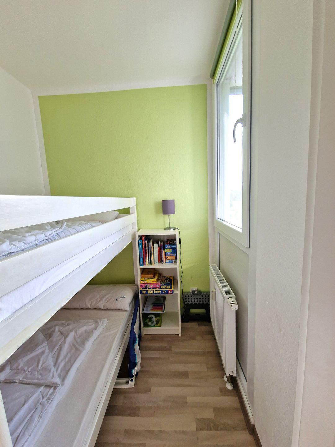 Im Kinderzimmer befindet sich ein helles Etagenbett (0,90 x 2,00m), welches auch von Kleinkindern genutzt werden kann, da ein Fallschutzgitter vorhanden ist. Das obere Bett des Etagenbetts ist ausschließlich für Kinder geeignet. Ein Kinderhochstuhl wird für die Kleinen ebenfalls zur Verfügung gestellt.