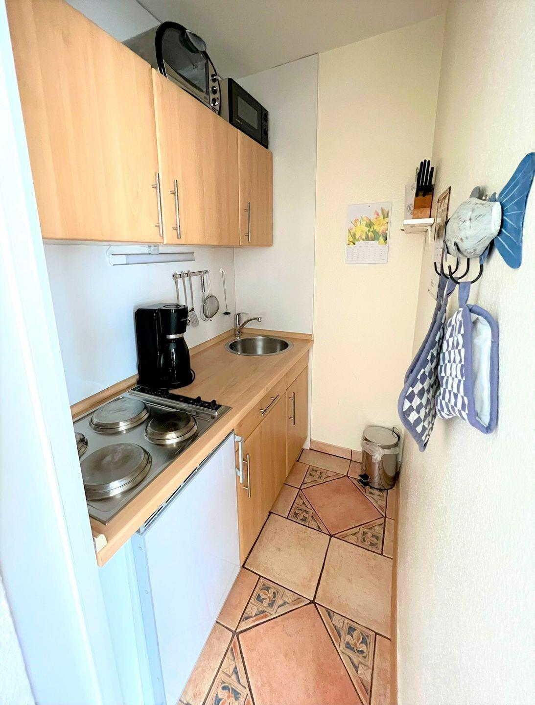 Küchenbereich mit 4- Plattenherd, Mini-Backofen, Kühlschrank und Kaffeemaschine.