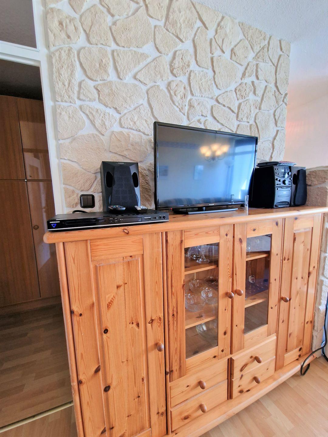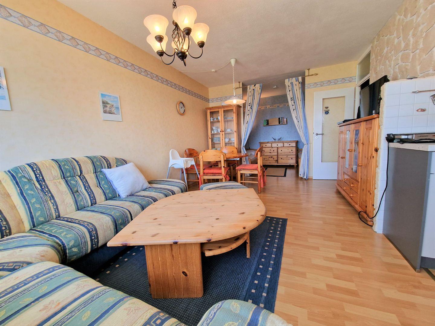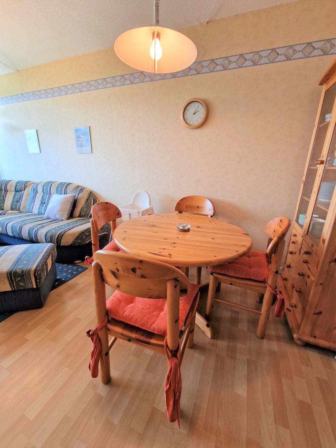 Der gemütliche Wohnbereich ist mit Laminat ausgelegt und verfügt über eine große Couchecke mit Flachbild-TV und einen integrierten Essbereich.