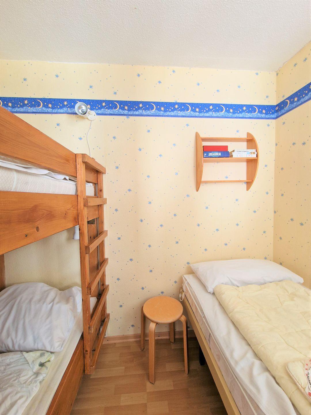 Im Kinderzimmer finden bis zu drei Personen Platz; hier steht ein Etagen (90 x 200) - und ein Einzelbett (90 x 180), jeweils aus Holz.