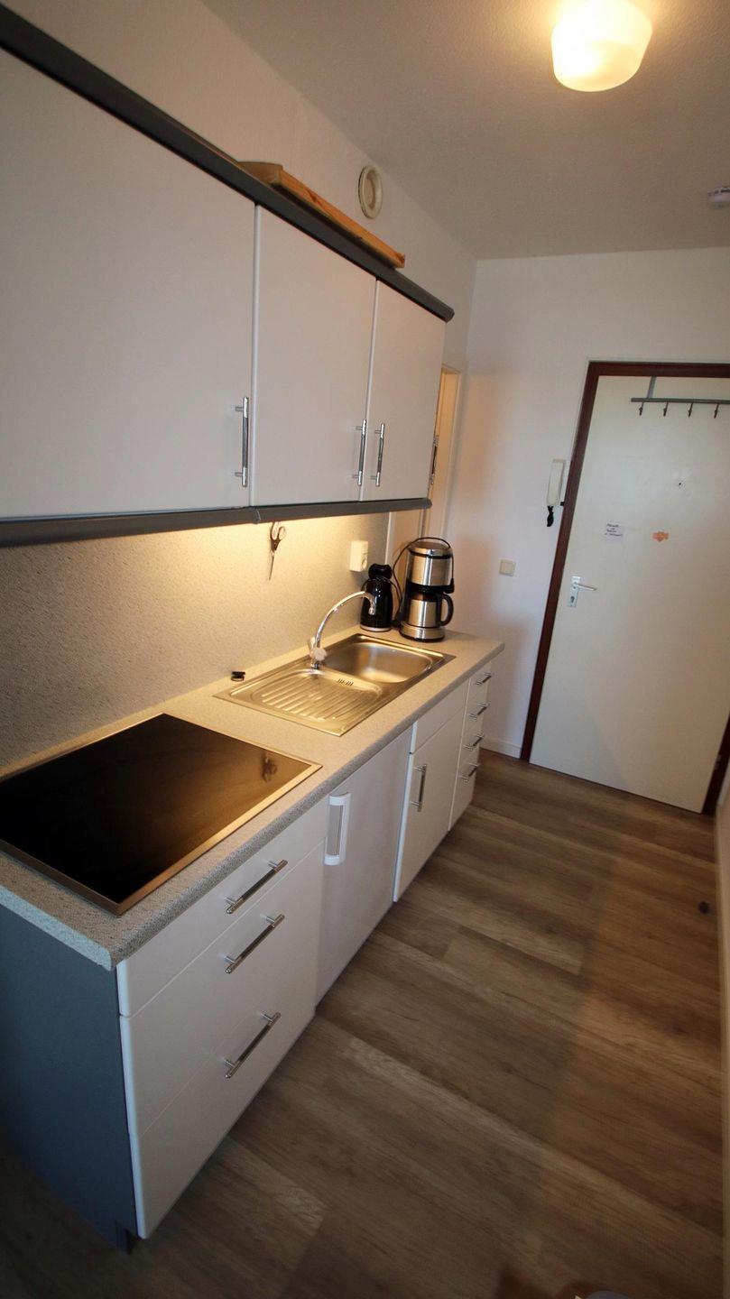 Die Küchenzeile verfügt über ein Ceranfeld, Kühlschrank und eine Kaffeemaschine.