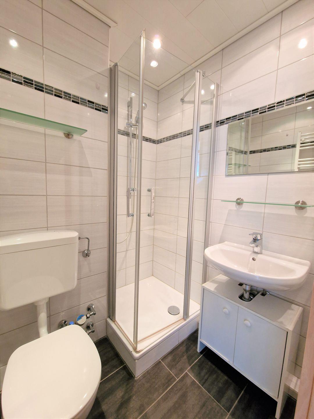 Das helle Bad ist mit einer Duschkabine ausgestattet und modern gestaltet.