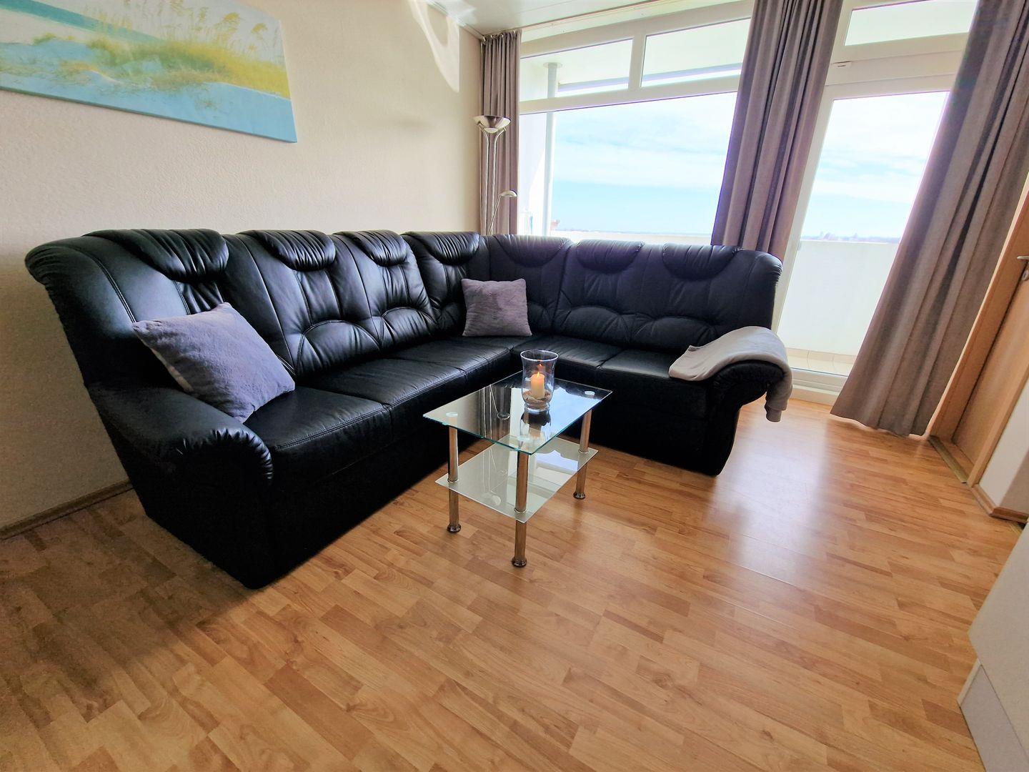 Auf dem Balkon zur Ostseite sind Sitzgelegenheiten vorhanden. Von hier aus haben Sie einen schönen Blick über den Binnensee in Richtung Yachthafen.