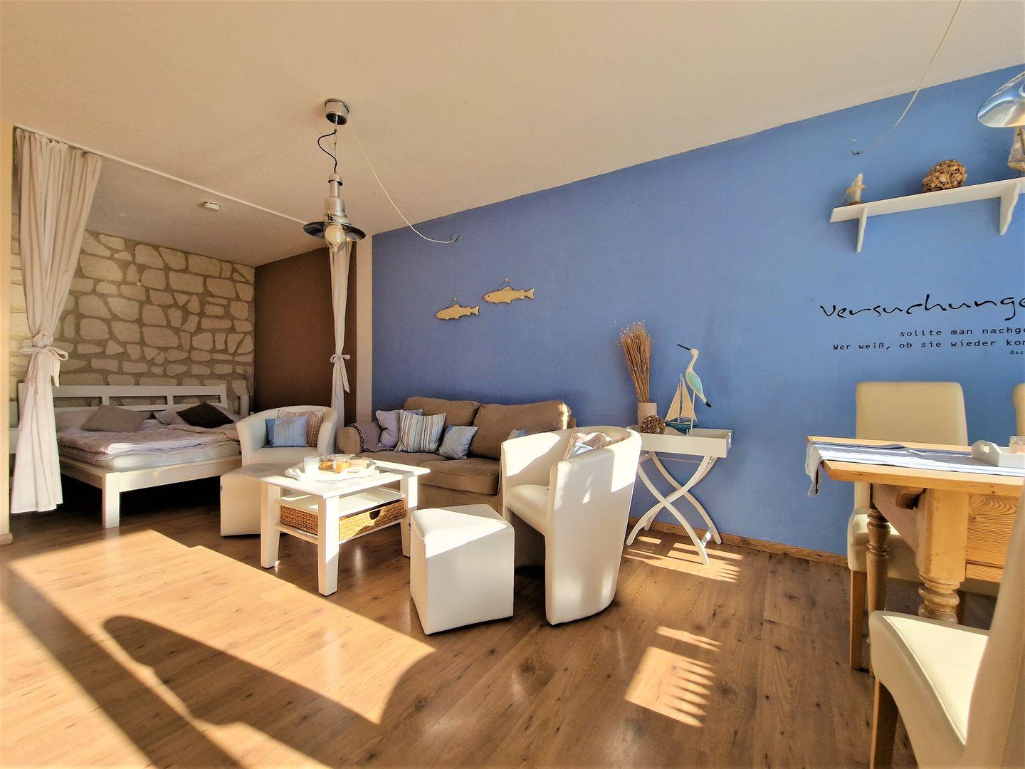 Schöne, maritim frisch und gemütlich eingerichtete Ferienwohnung in der 1. Etage mit Balkon zur sonnigen Süd-/Westseite.