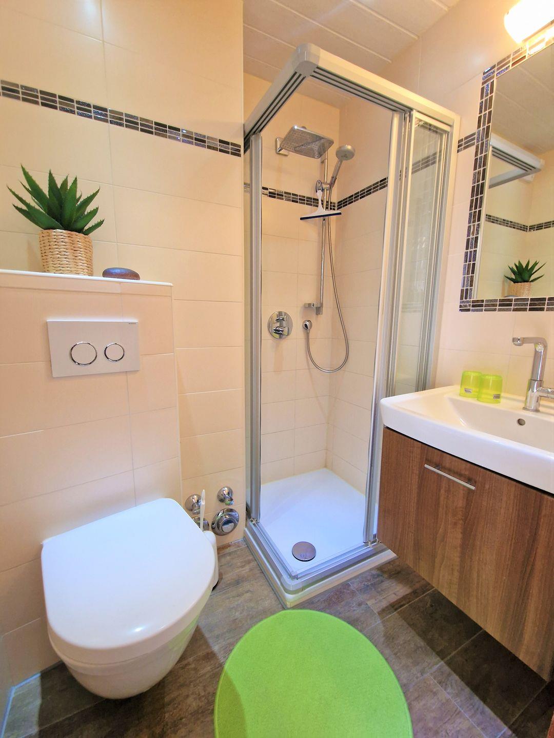 Traum-Badezimmer (!) mit Duschkabine und bodennahem Einstieg und modernem Hänge-WC.