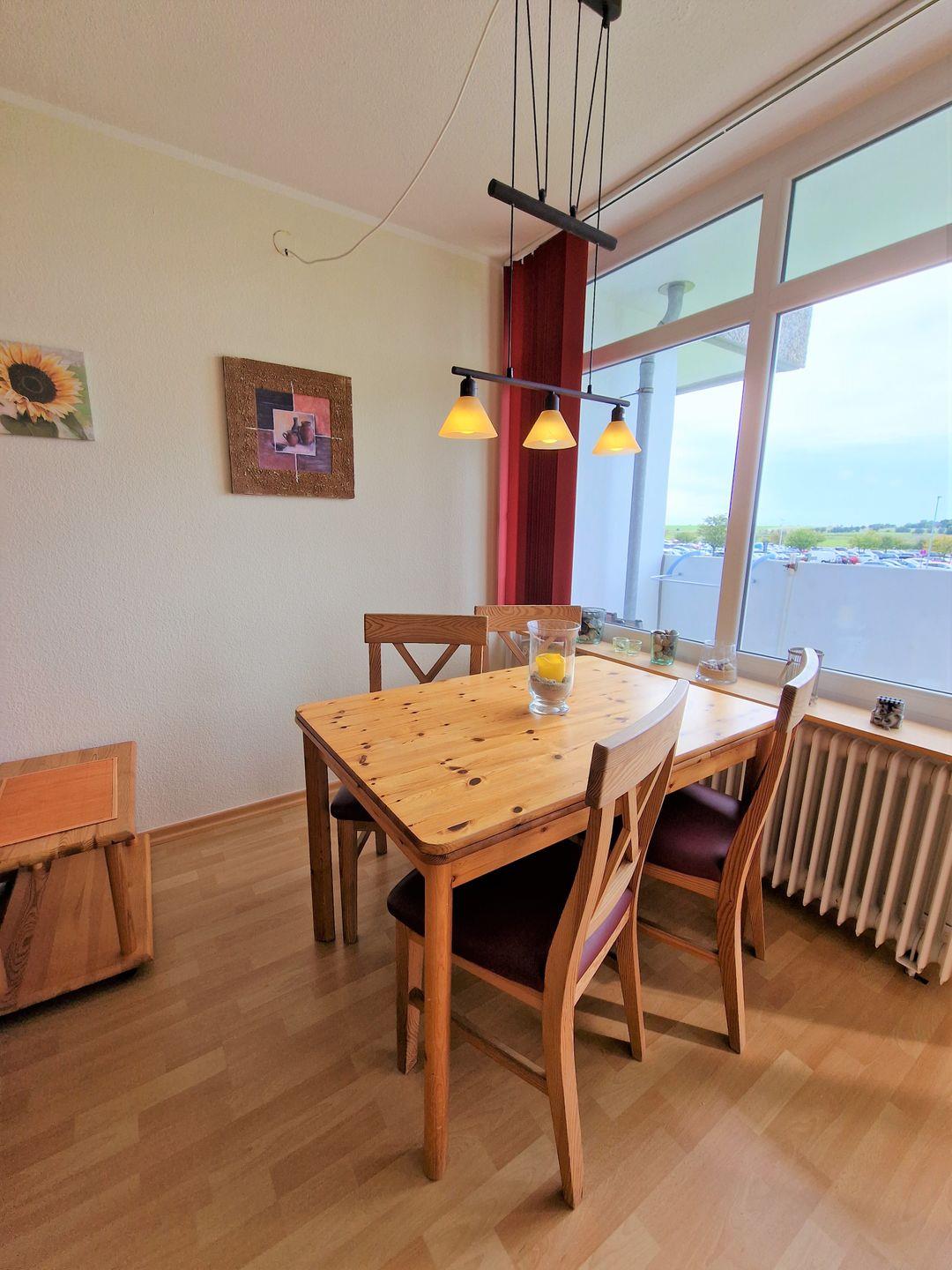 Die im Wohnbereich integrierte Essecke befindet sich direkt am Fenster.