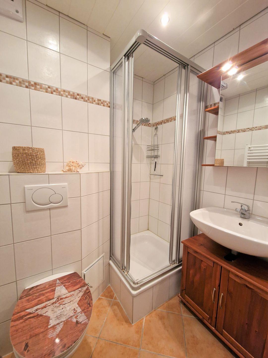 Von dort aus gelangen Sie zum Badezimmer, welches mit einer Dusche (Duschkabine, hoher Einstieg), WC ausgestattet ist (Fön vorhanden).