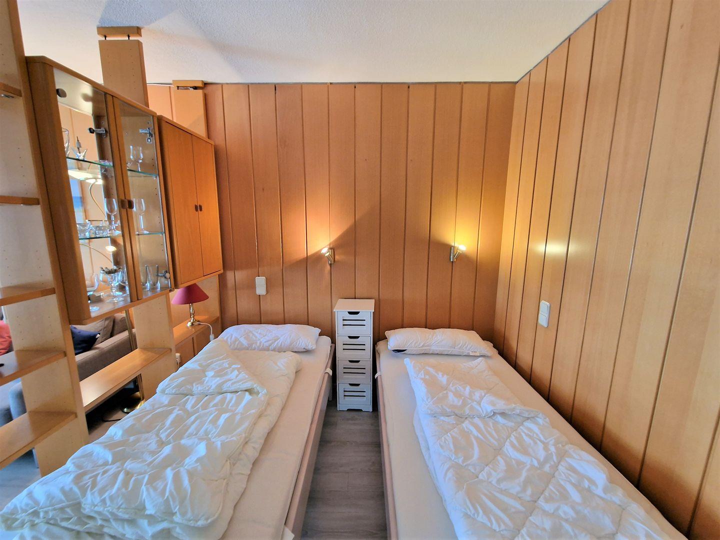 Die zwei Einzelbetten im Schlafbereich können zu einem Doppelbett zusammengeschoben werden.