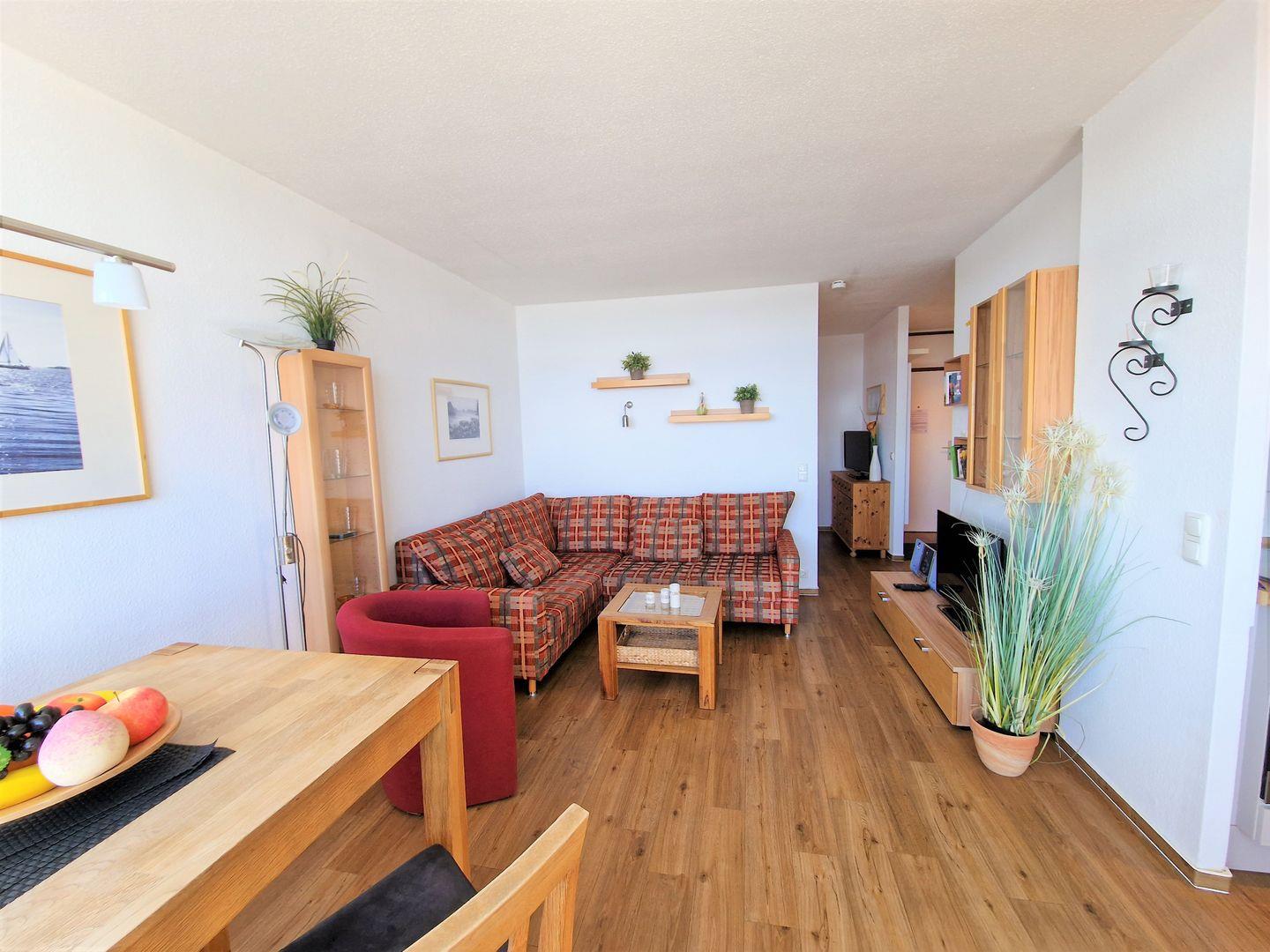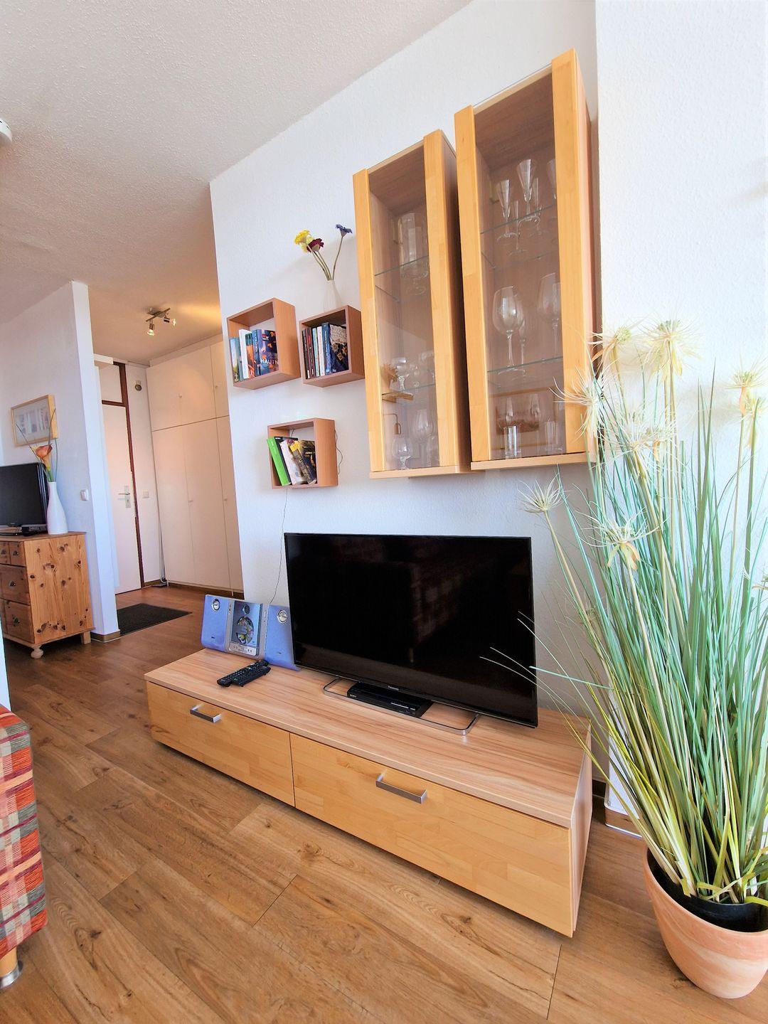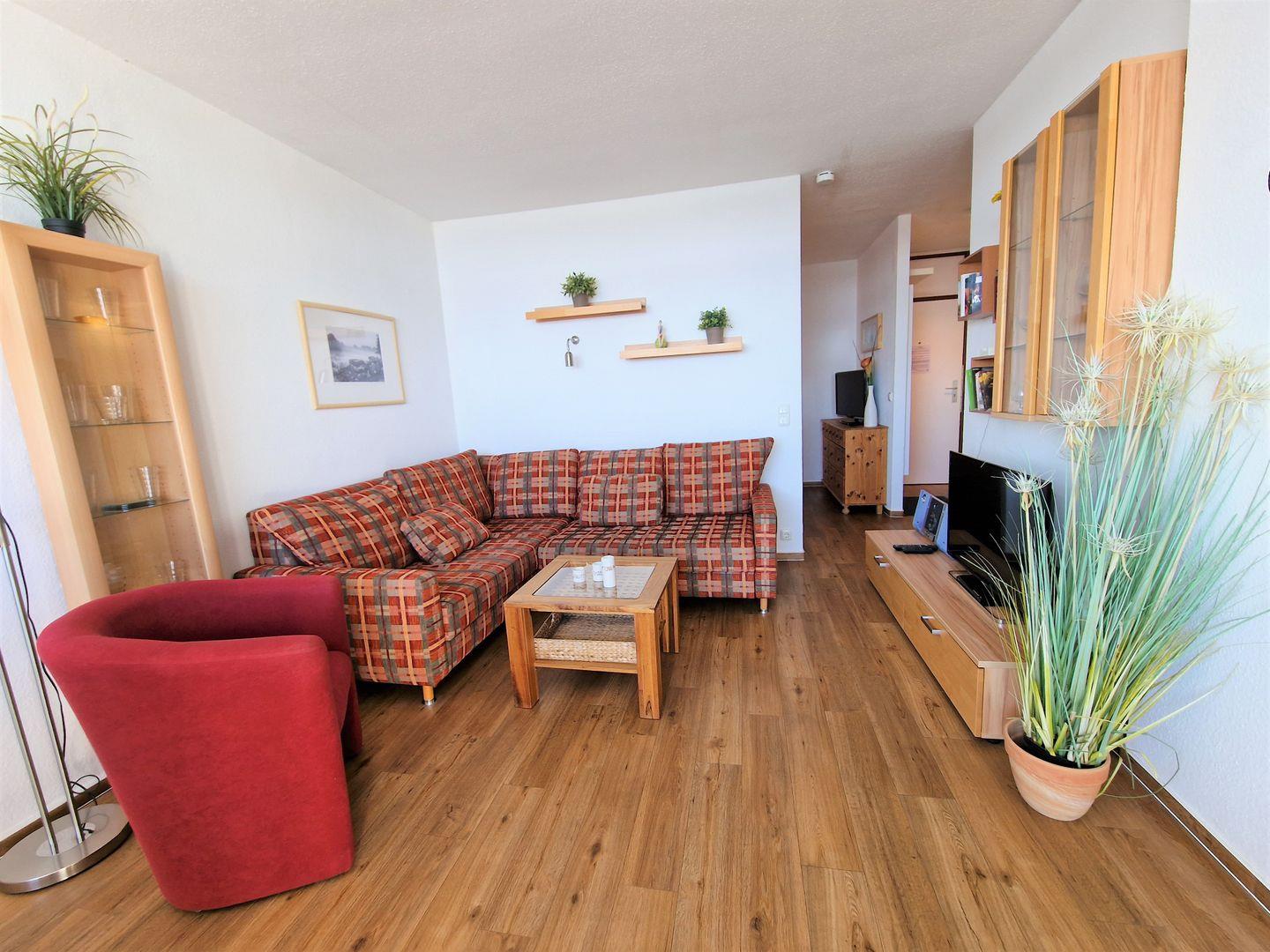 Im Wohnbereich, erwartet Sie eine gemütliche Couch mit Sessel, sowie ein Flachbildschirm mit WLAN Funktion (100 cm Durchmesser), -die Möglichkeit Netflix, (eigener Account notwendig) ist gegeben. Eine Hifi-Anlage mit CD Funktion und ein DVD Player steht