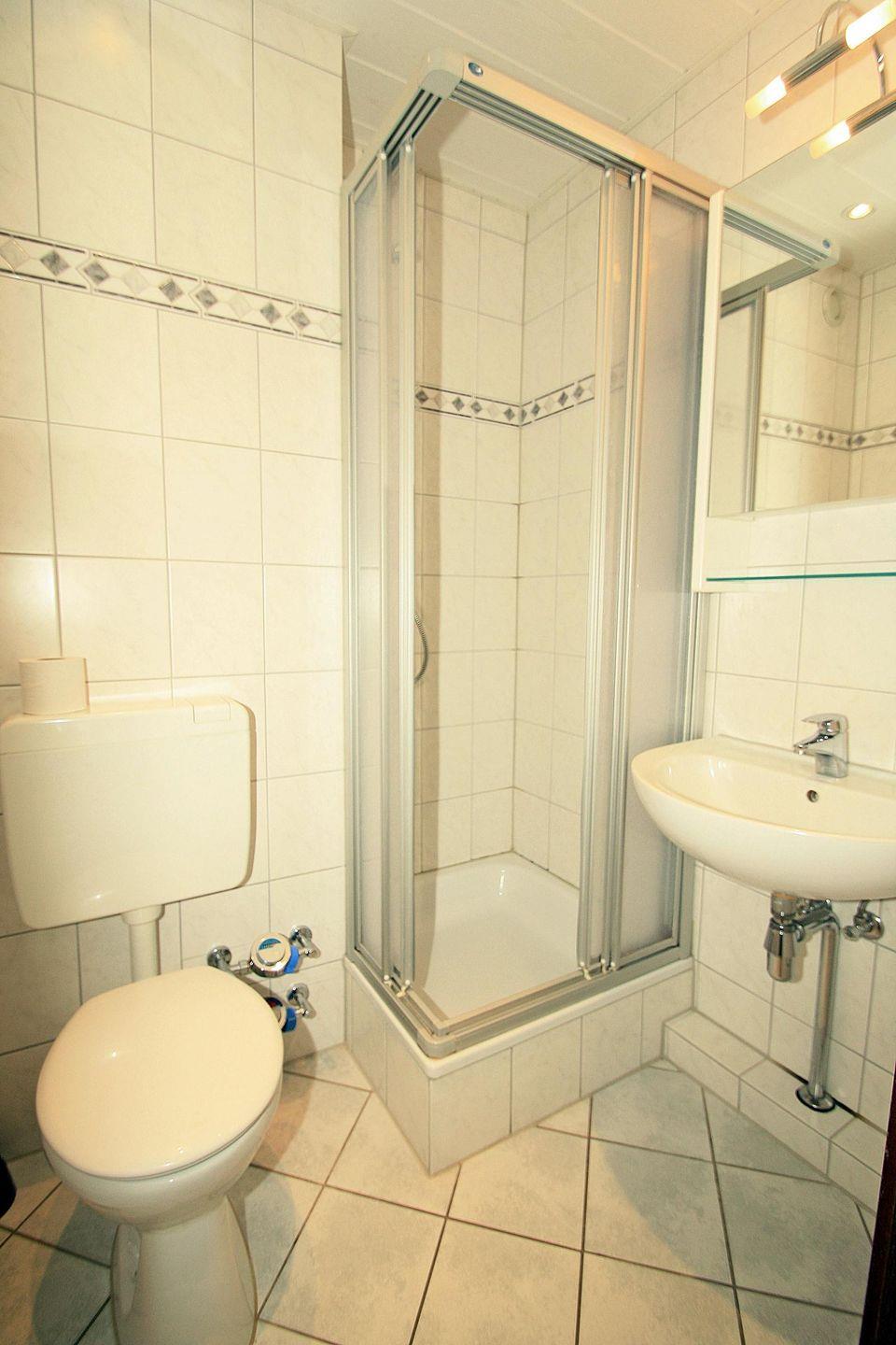 Das innenliegende Dusch-Bad ist mit tiefer Duschwanne, fester Duschwand, beleuchtetem Spiegelschrank und Handtuch-Heizkörper ausgestattet.