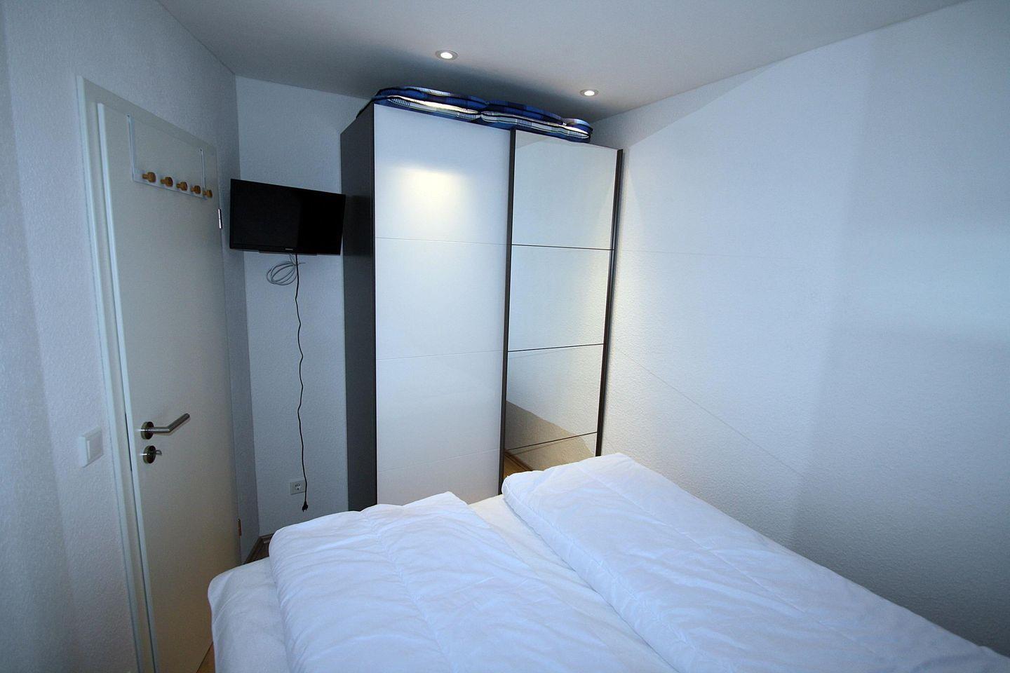 Im separaten Schlafzimmer stehen den Gästen ein Boxspringbett (160 x 200cm) sowie ein weiterer TV und ein Schrank mit Ablagefläche zur Verfügung.